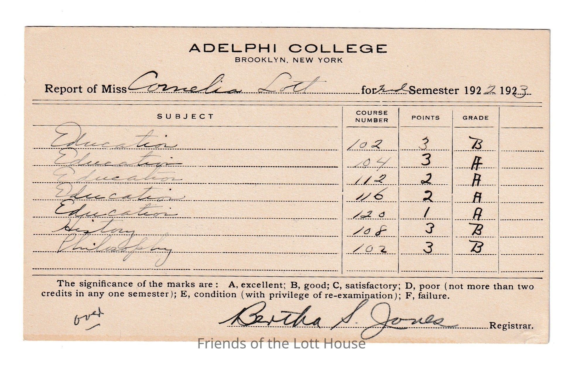 Adelphi College Report Card for Cornelia Lott September 1922/`923Collection