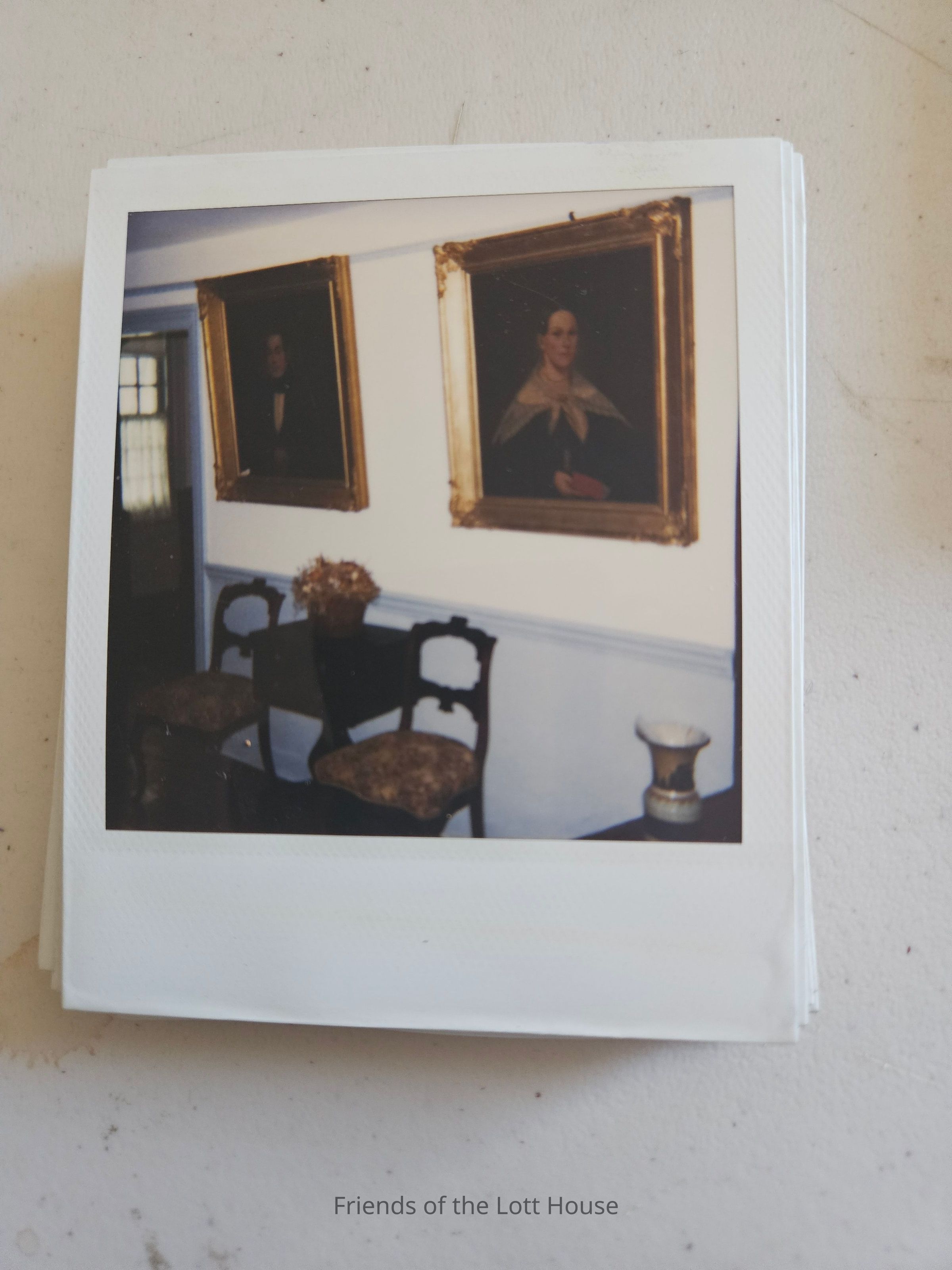Photograph of two paintings hanging on a wall above a table and two chairsCollection