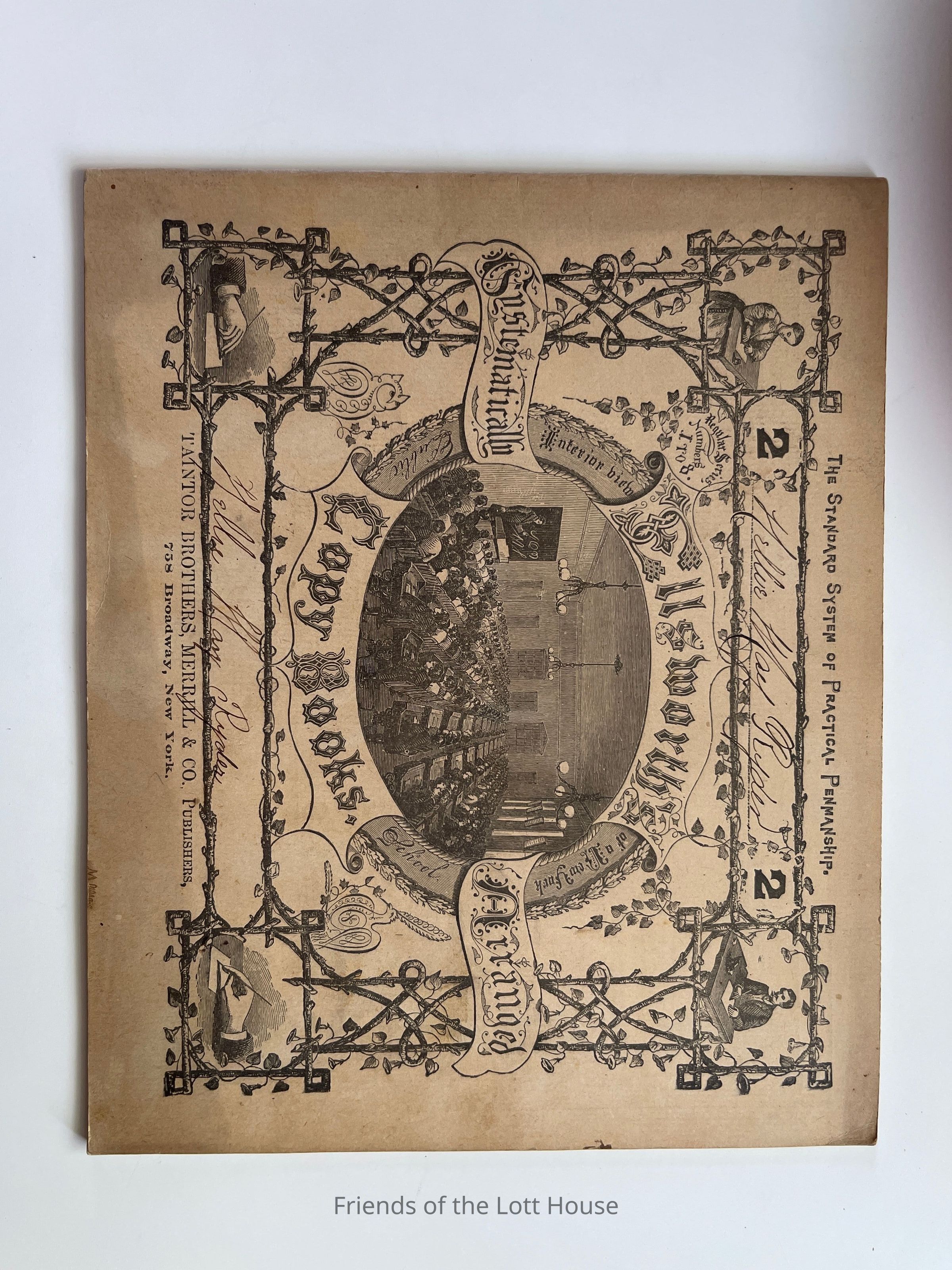 Penmanship notebook with intricate cover design, Nellie Ryder's name written on the cover and practice words on the insideCollection