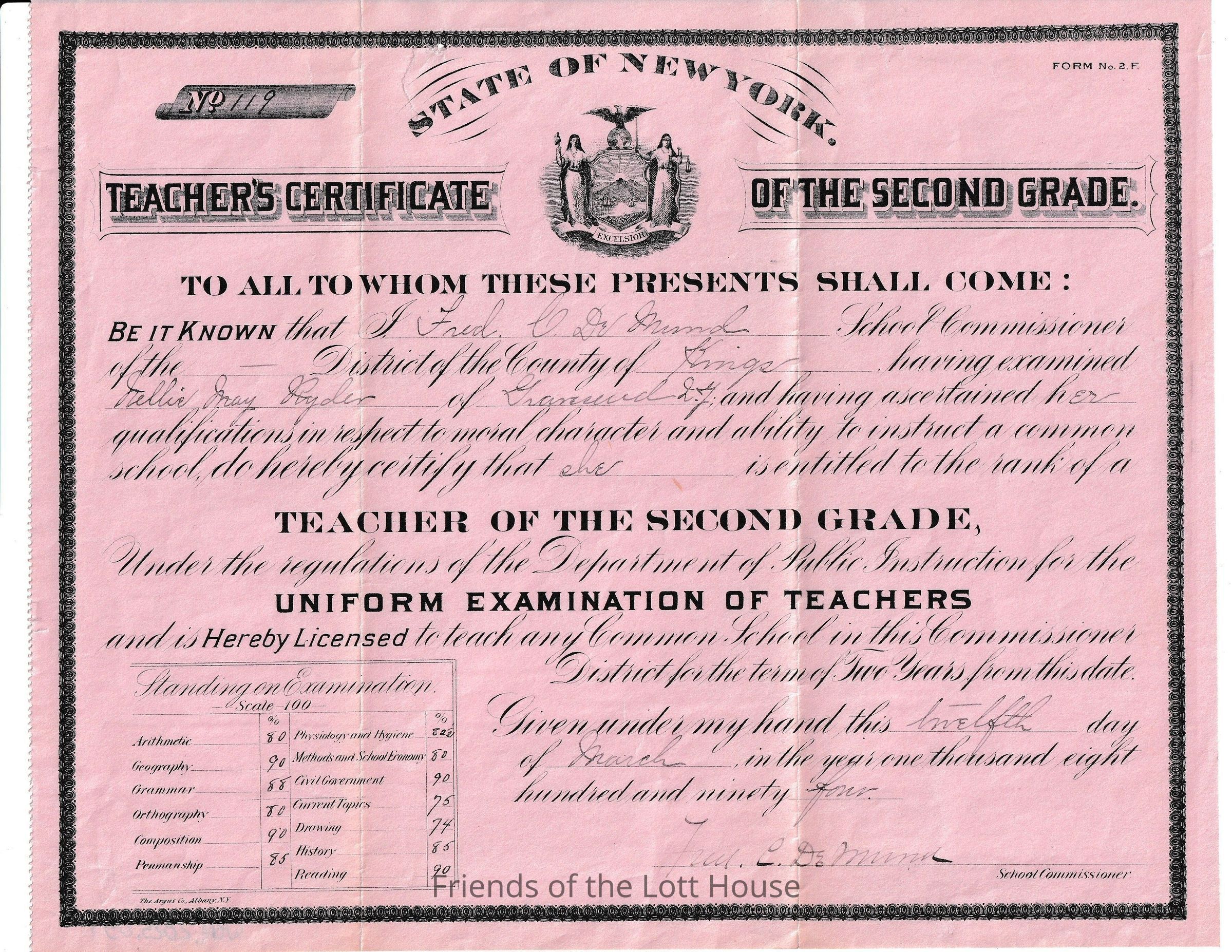 Teacher certificate belonging to Nellie May Ryder. Granted to her in March 1894Collection