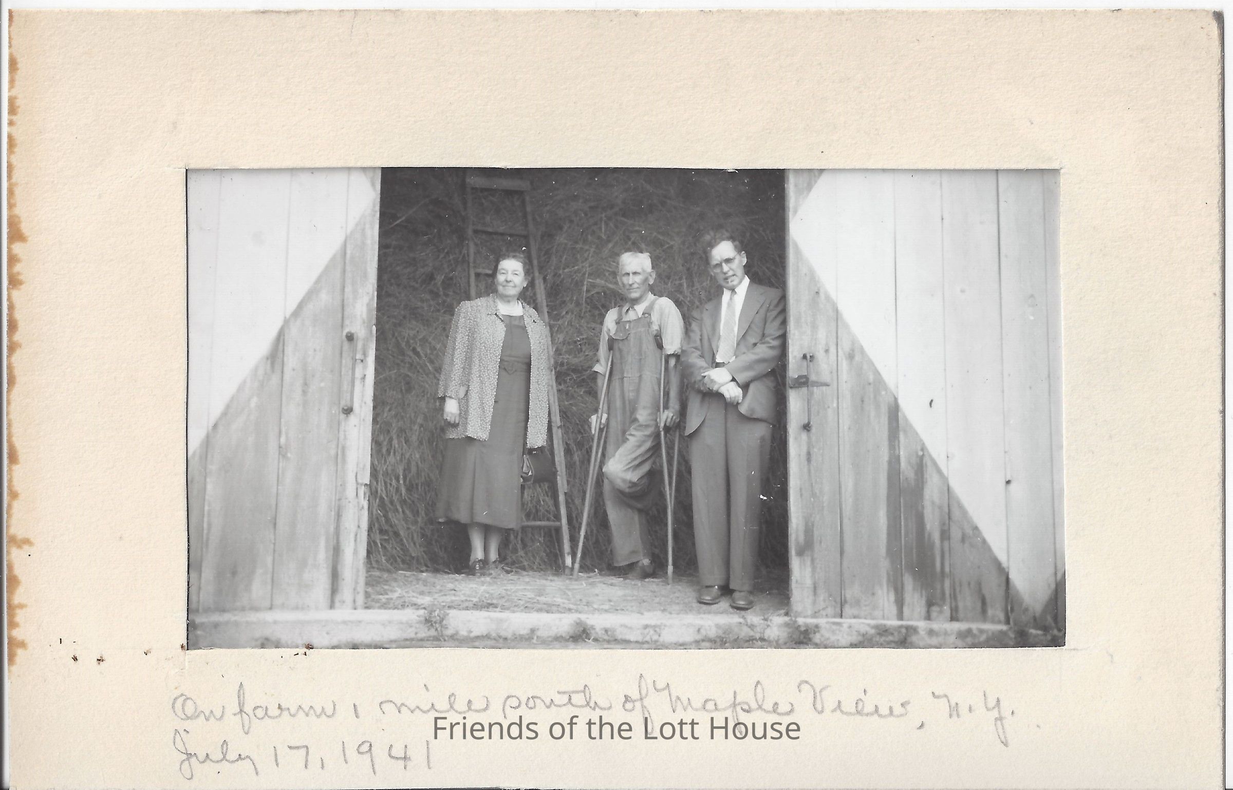 Photo of Nellie May Bennett, Curtis, and one elder man (amputee), standing in entrance of barn. Same event as above. Photo attached to a photograph mat.Photograph Details