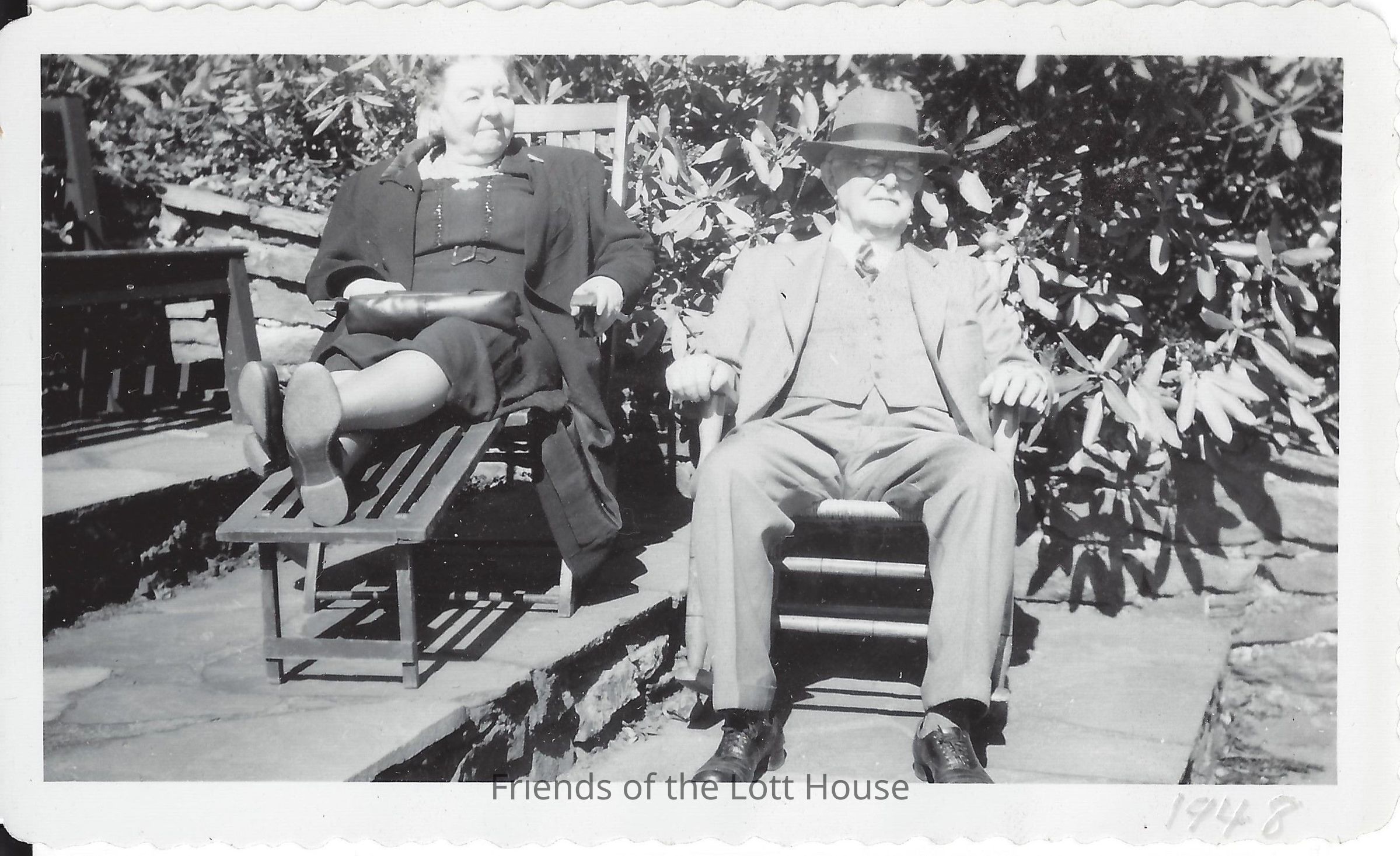 Photo of Nellie May Bennett and man, sitting on lounge chairs outside.Photograph Details