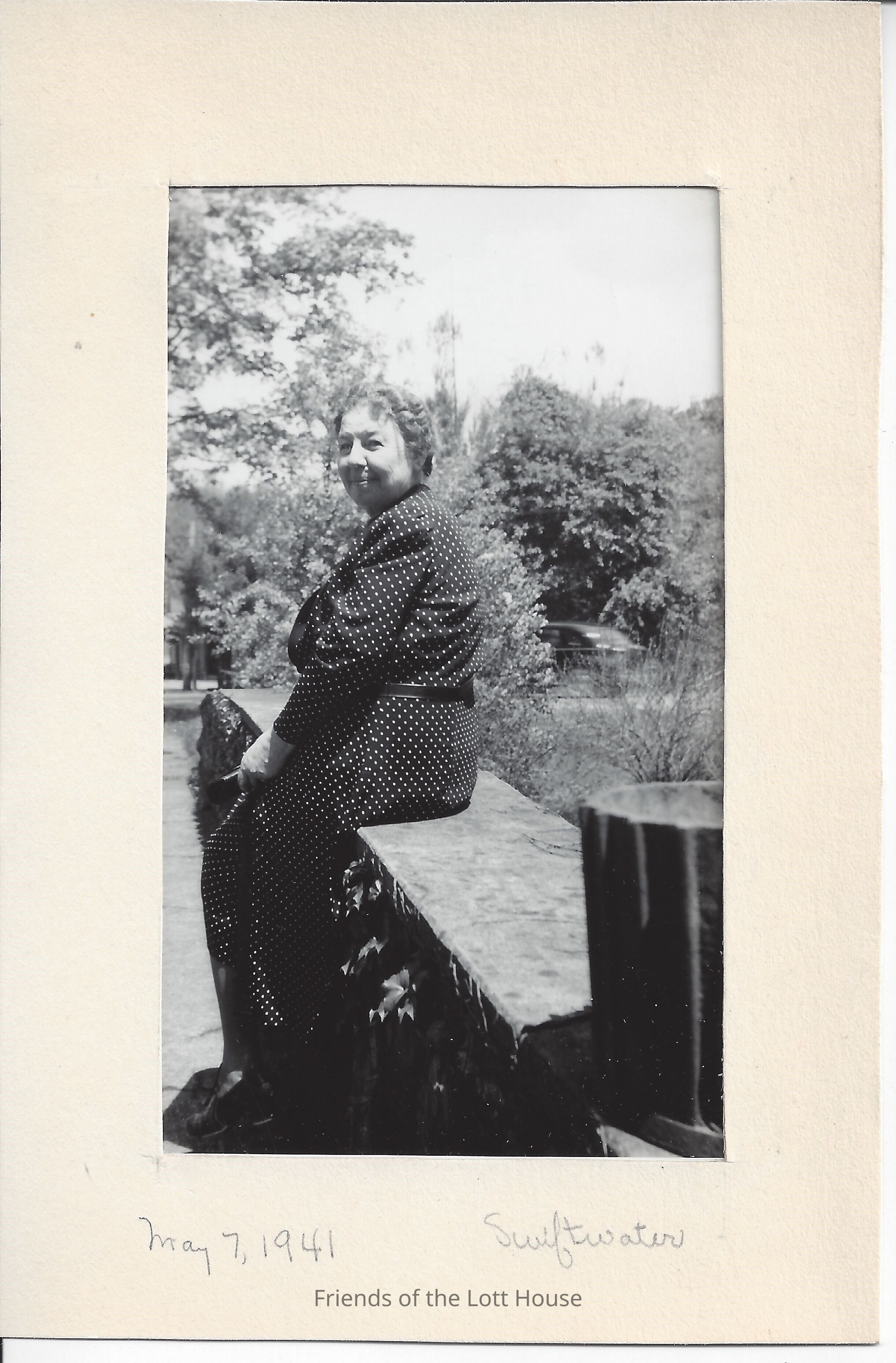 Nellie May Bennett sitting on bench outside. Photo attached to a photograph mat.Photograph Details