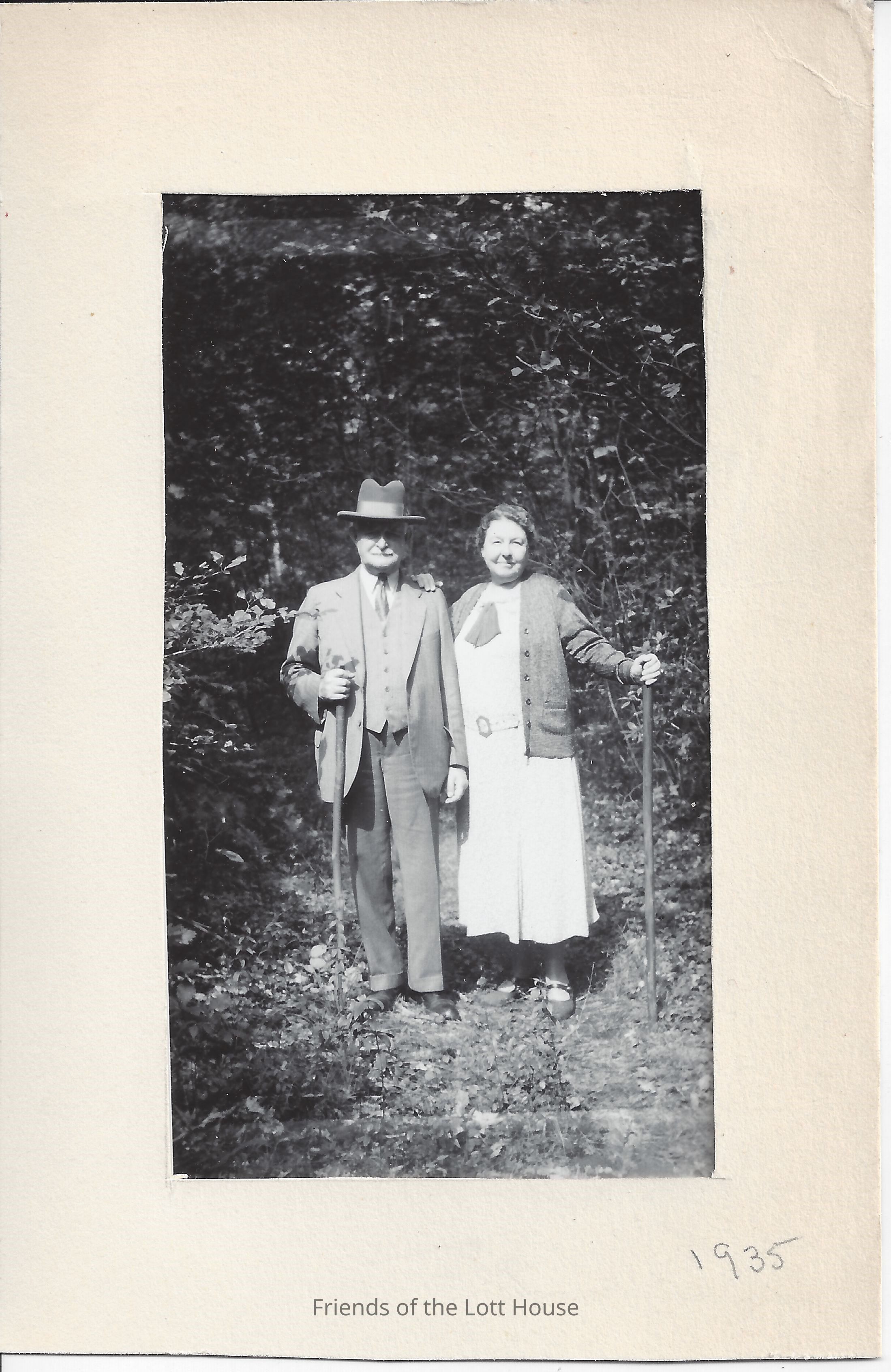 Couple standing outside in garden. Photo attached to a photograph mat.Photograph Details