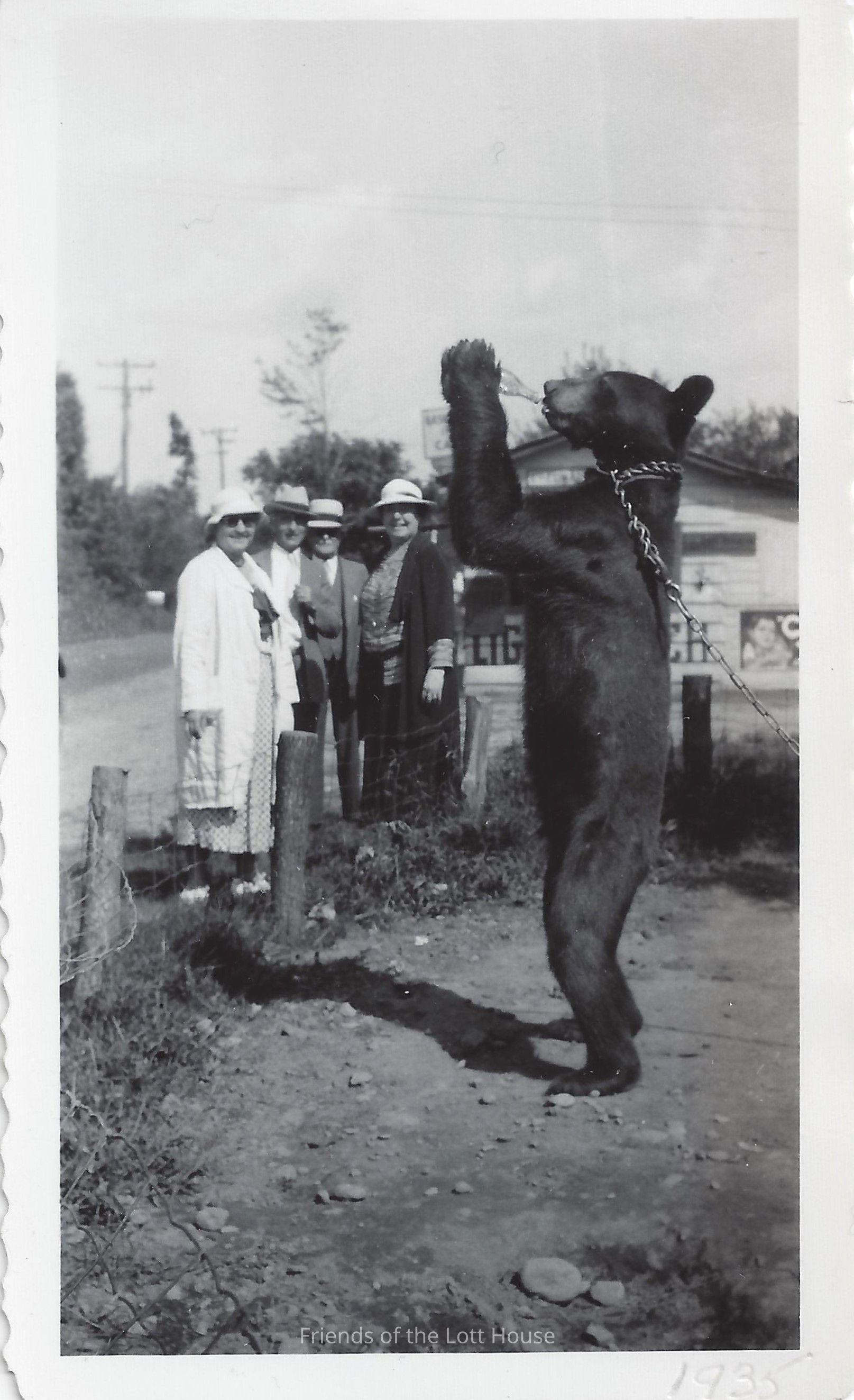 Two men and two women standing outside in front of bear(unclear whether or real or statue) on chain leash.Photograph Details