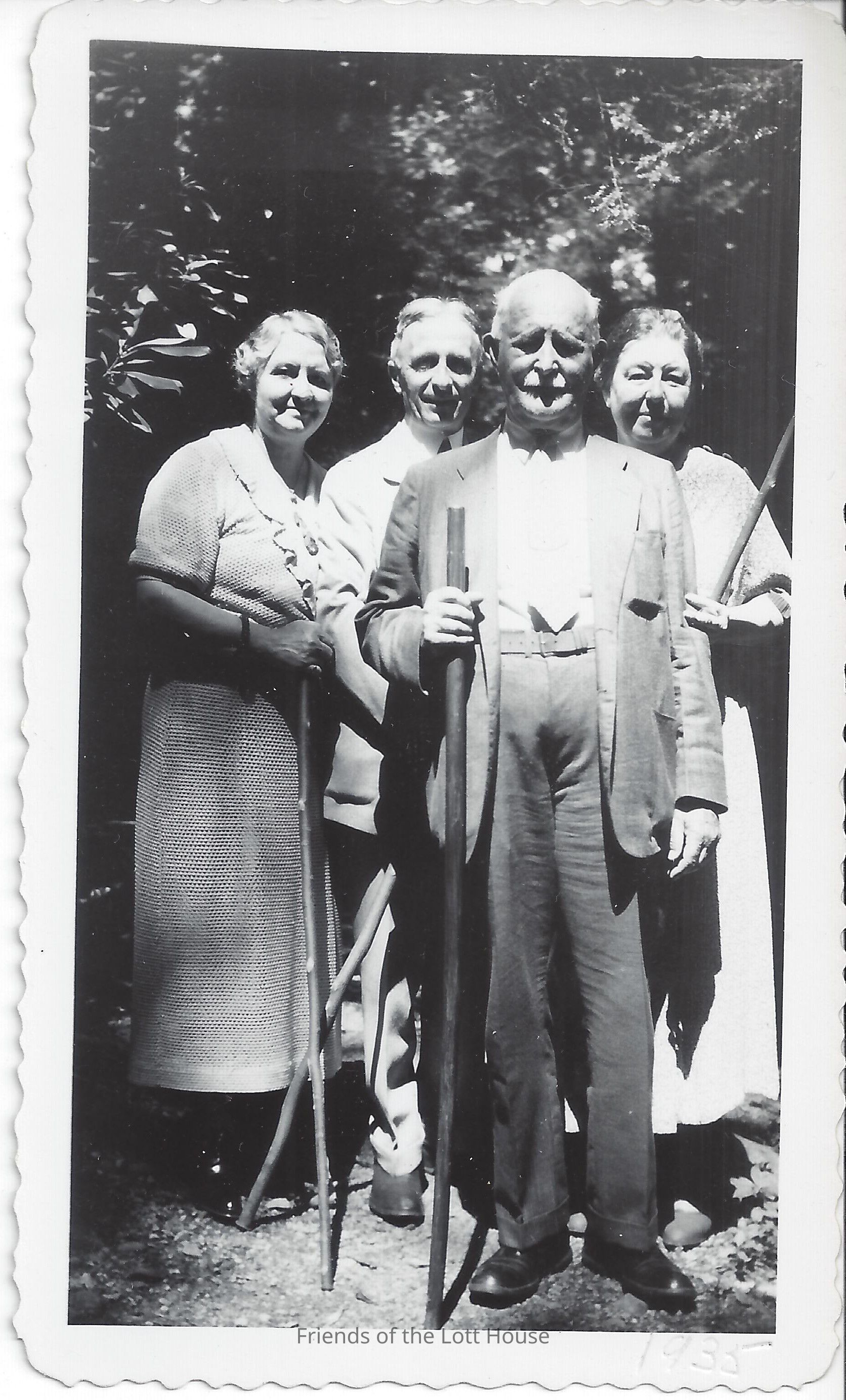 Group of two men and two women, standing together outside.Photograph Details