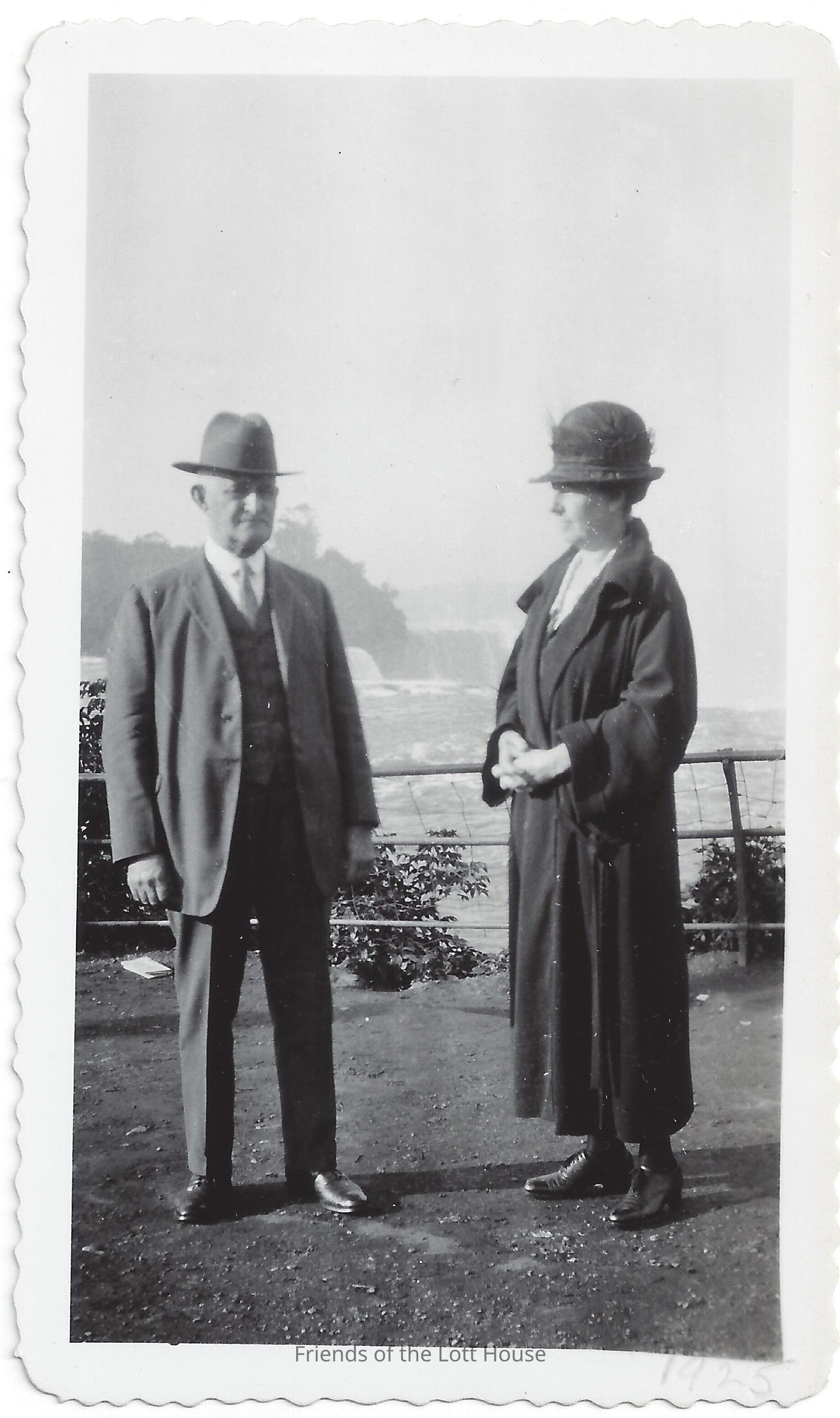 Man and woman standing outside at a lookout point, with view of Niagra Falls behind them.Photograph Details