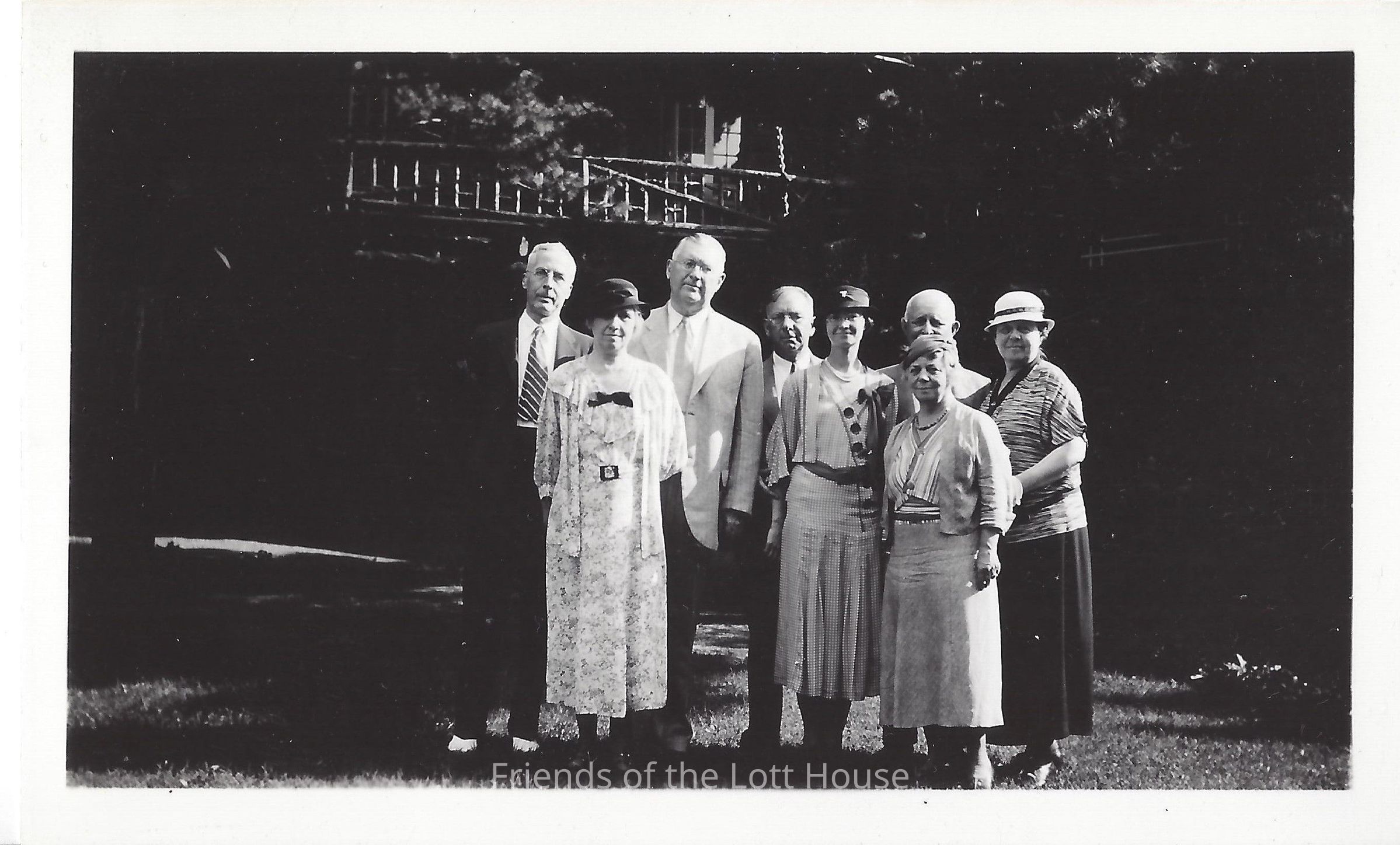 Four women and four men posing in a group outside, in front of what looks like a wooden fence or gate.Photograph Details