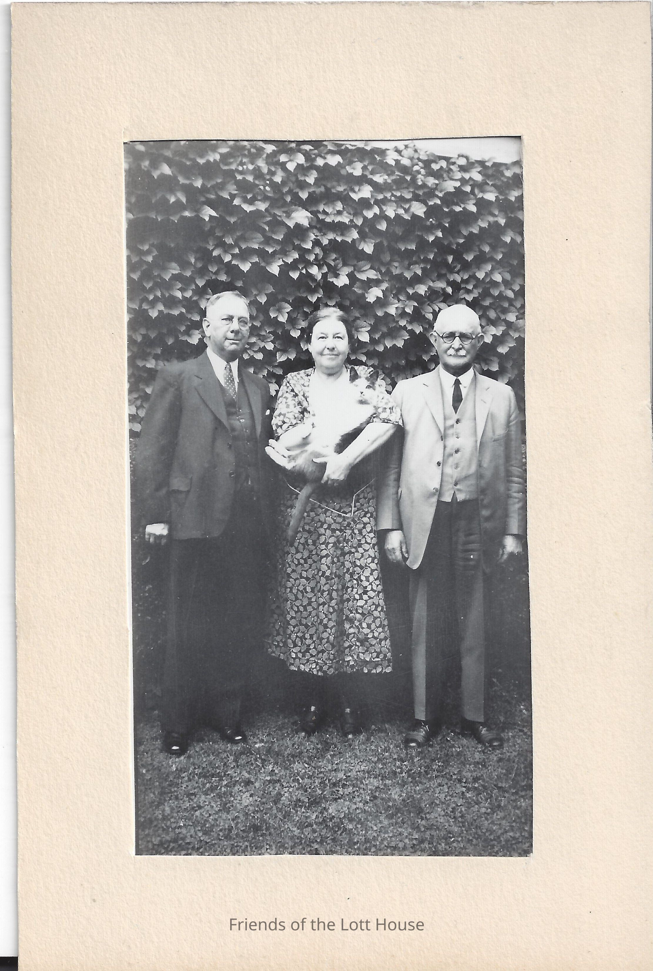Nellie May Bennett, cradling cat, and two men standing in front of hedge. Photo attached to a photograph mat.Photograph Details