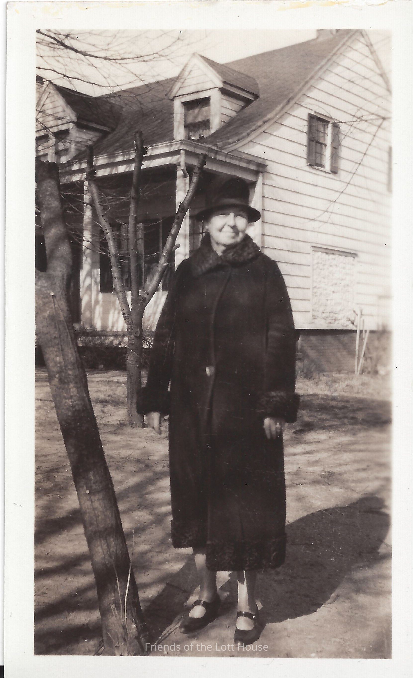 Nellie May Bennett standing on front lawn in front of house.Photograph Details