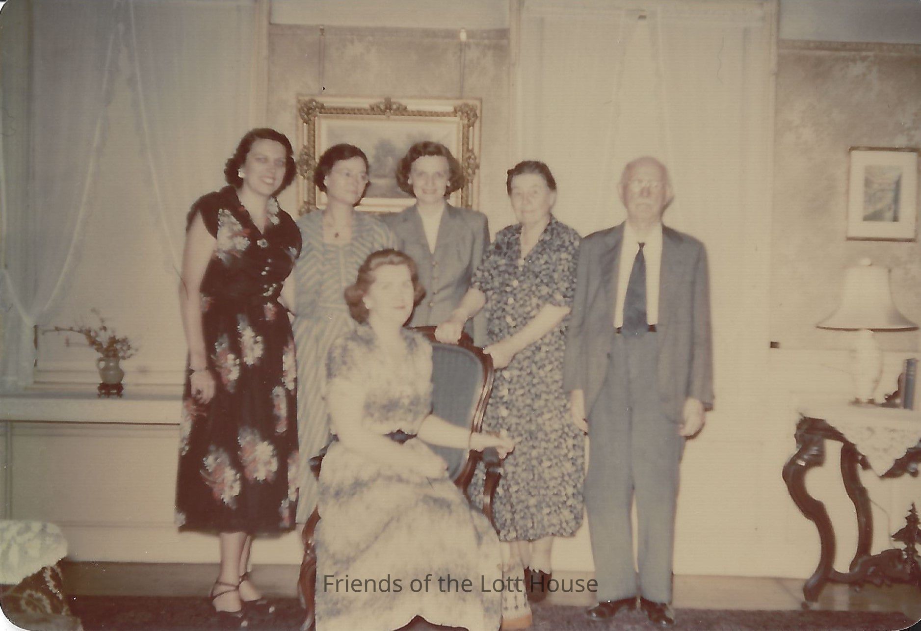 Color glossy photo of four women and one man standing around fifth woman, seated. Inside a parlor or living room.Collection