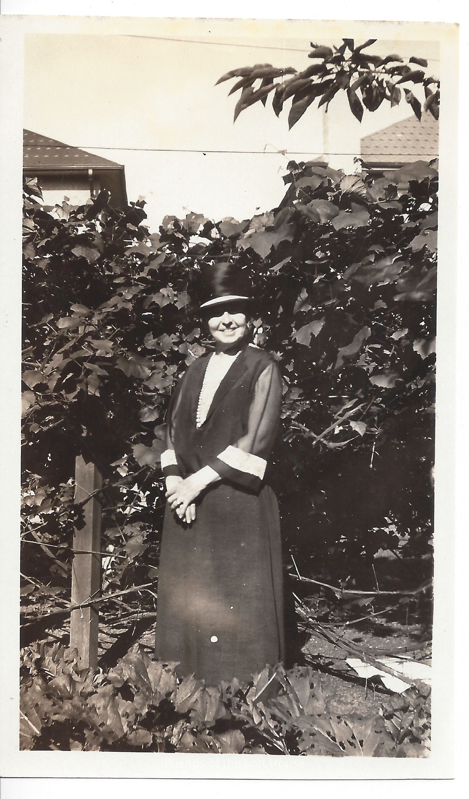Nellie May Bennett standing in garden in front of hedge.Photograph Details