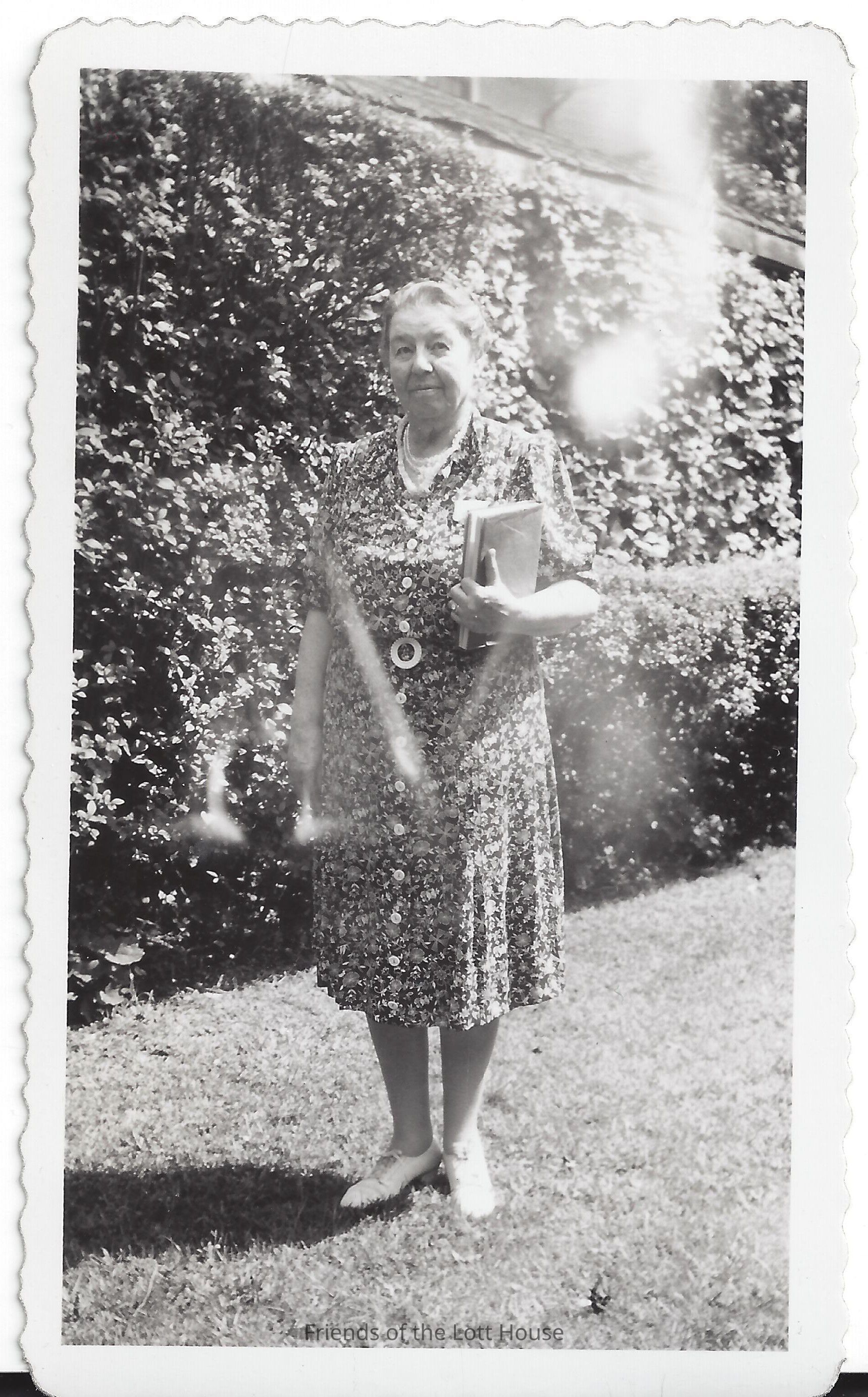 Woman standing outside in front of garden hedge.Photograph Details