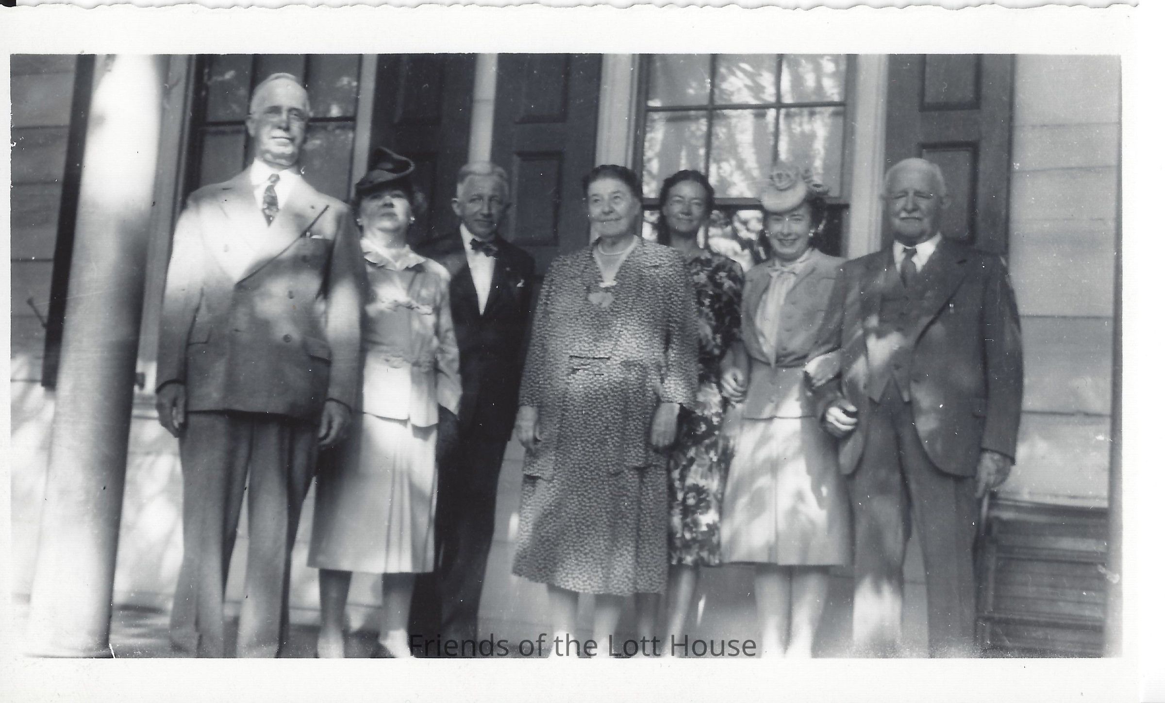 Four women and three men standing in a group on front porch outside of house.Photograph Details