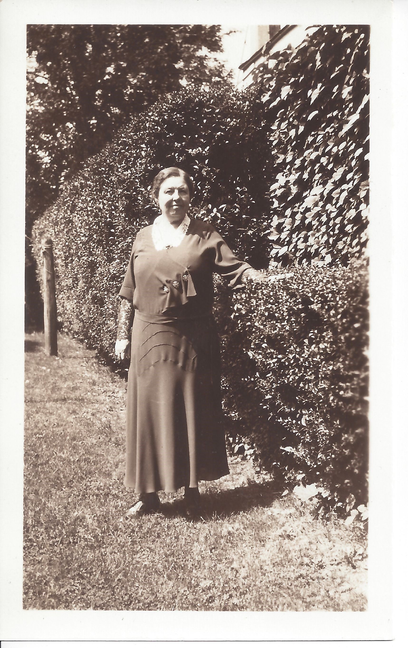 Nellie May Bennett posing outside in front of hedge.Photograph Details