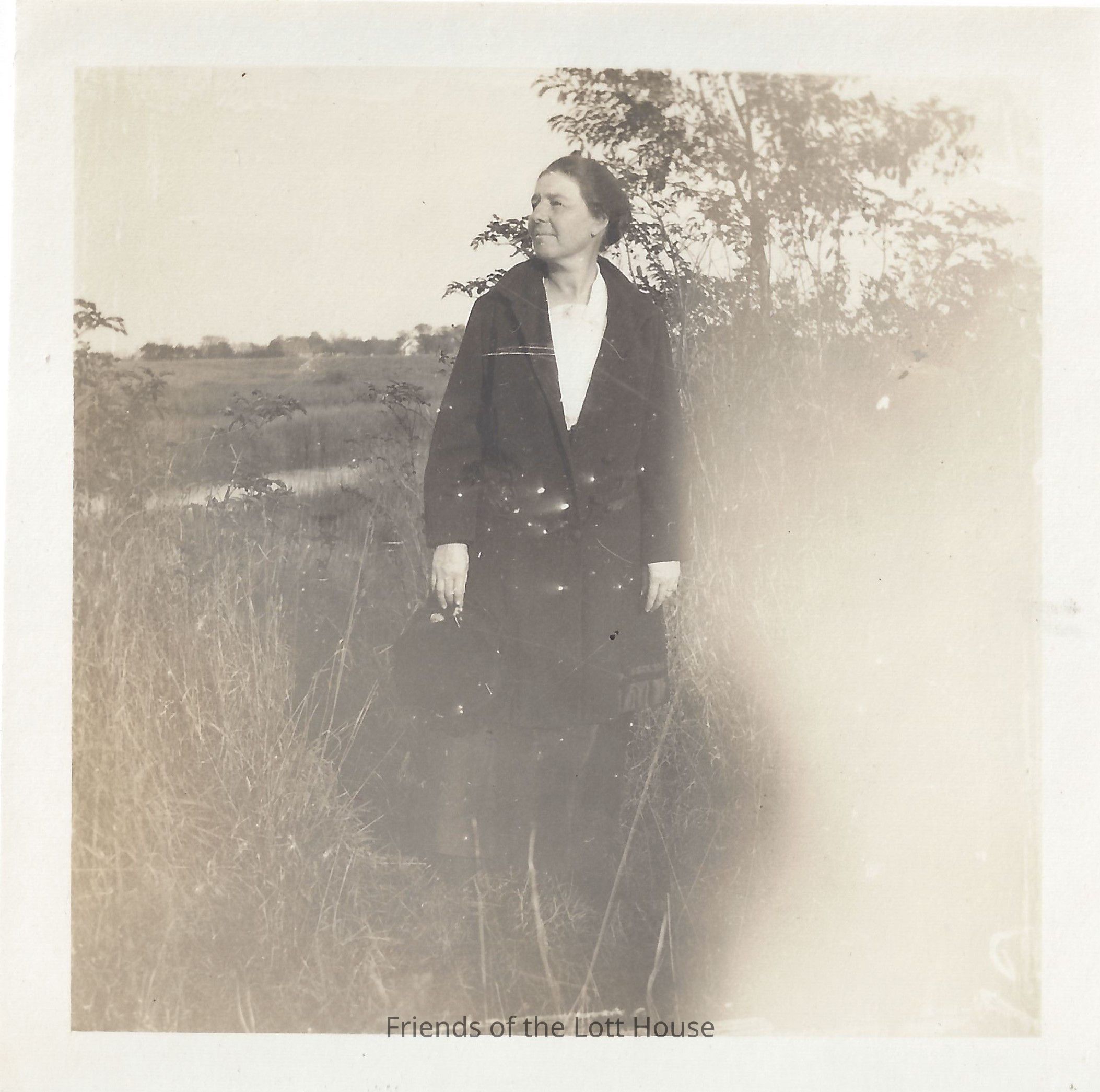 Woman posing outdoors in front of pond.Photograph Details