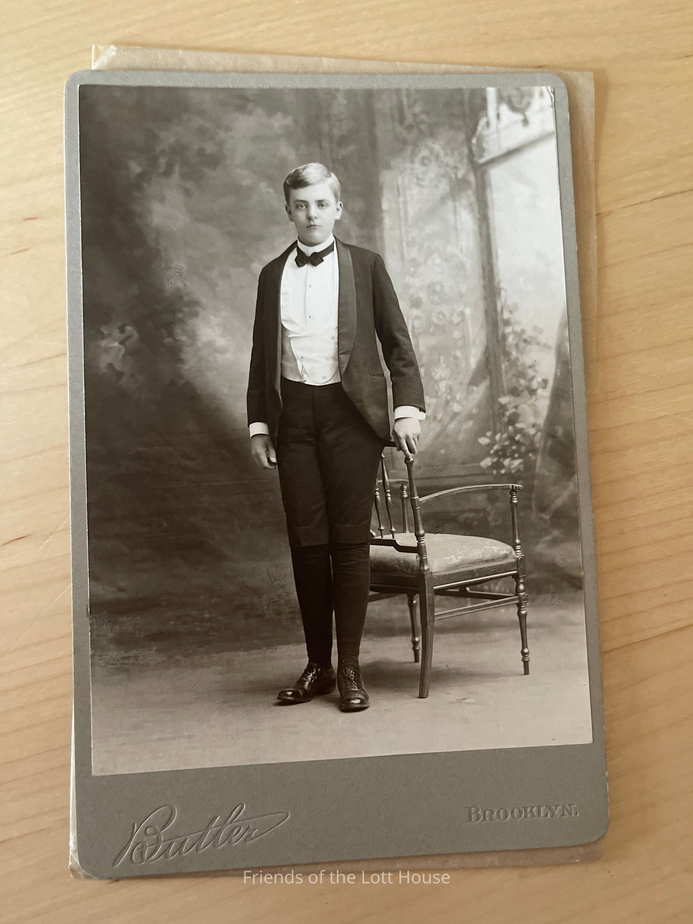 Photograph of boy standing with hand on chair. Has paper cover with "Butler" written across it. Charles A. DitmasCollection