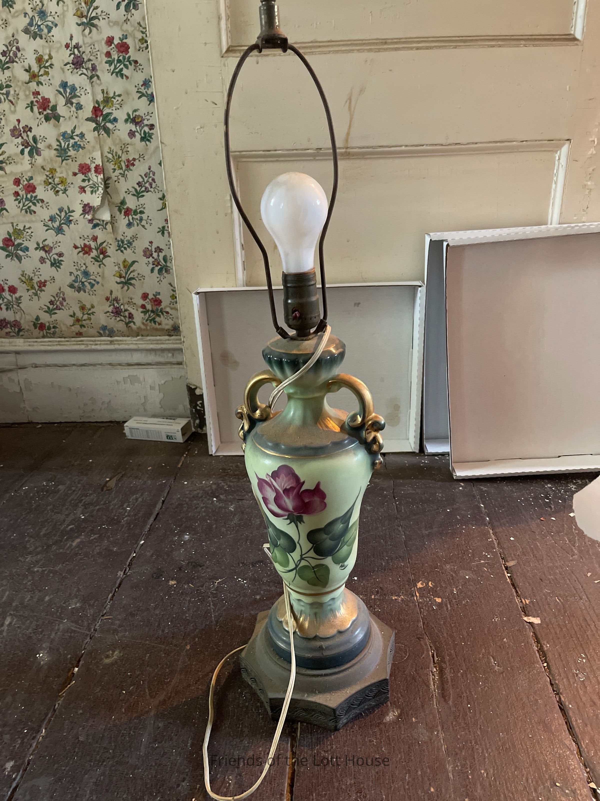 Table lamp, ceramic body with metal base. Pale green vase shaped body with gold painted ornamental handles. Central painted decoration, a red rose with stem and leavesCollection