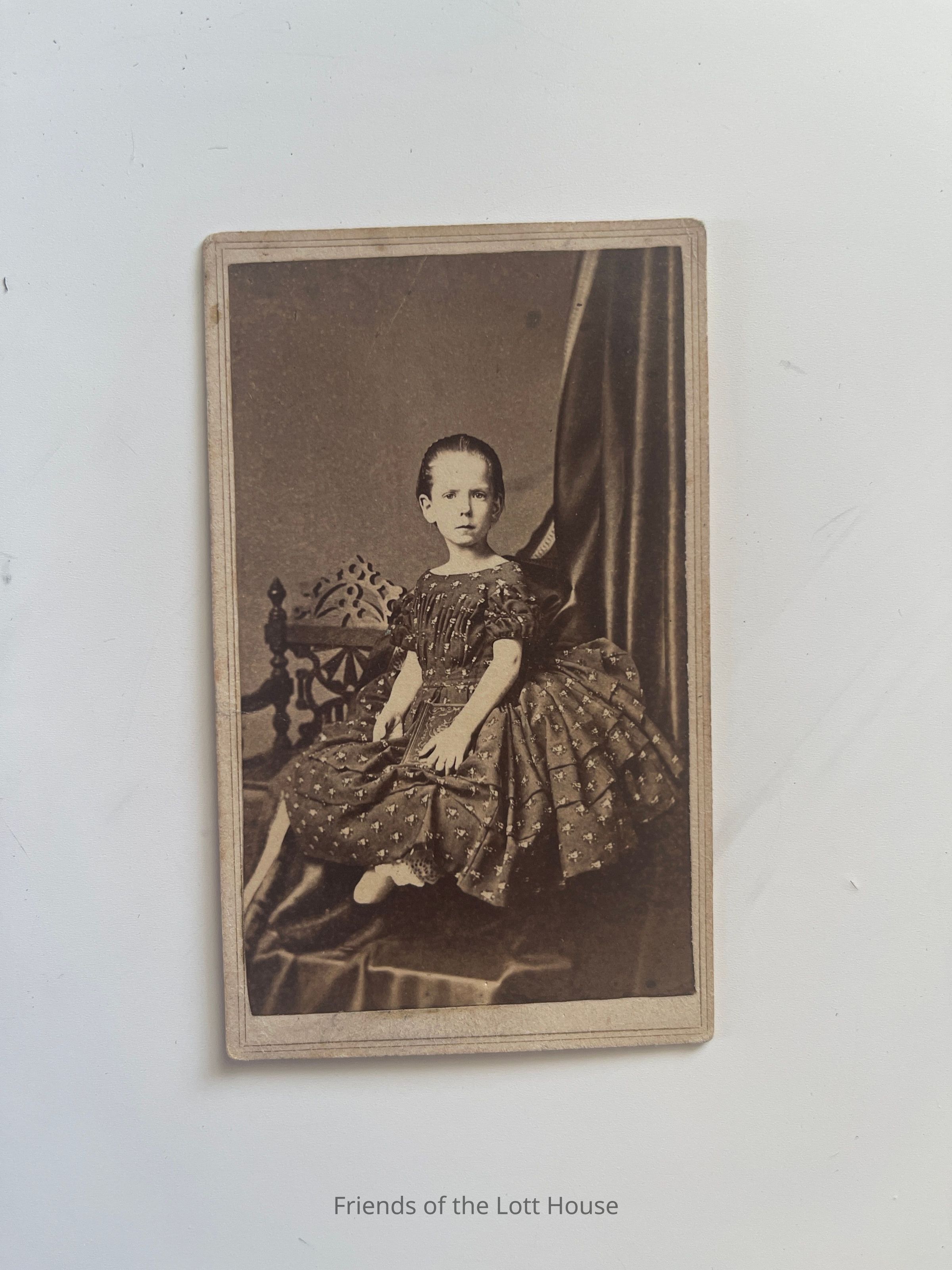 Young girl posing for photograph wearing long patterned dress. Eliza Van GuiseCollection
