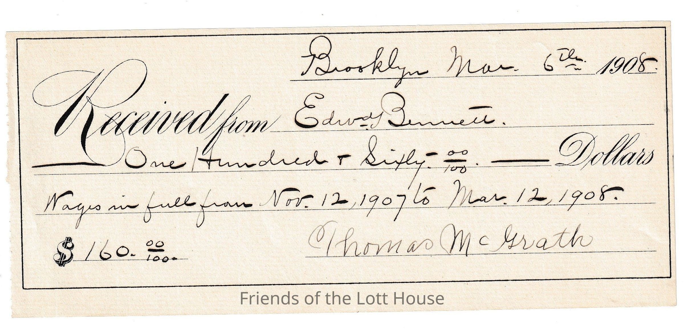 Check for $160 Edward Bennett, Wages in full from Nov 12, 1907 to March 12th 1908 signed by Thomas McGrathCollection
