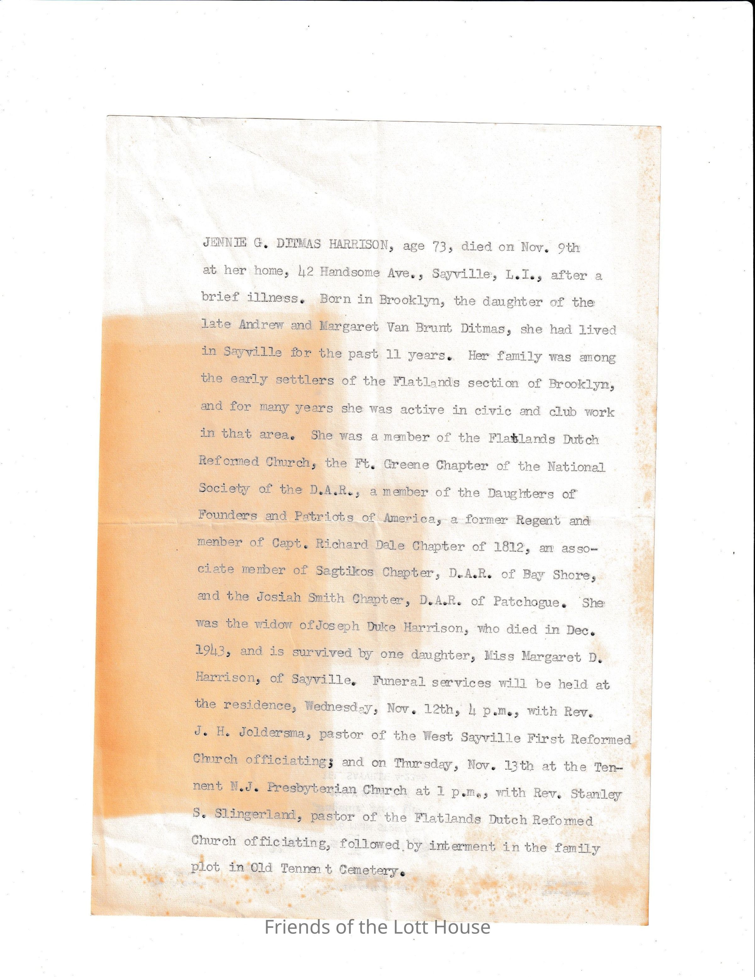 Summary of the life and death of Jennie G. Ditmas HarrisonCollection