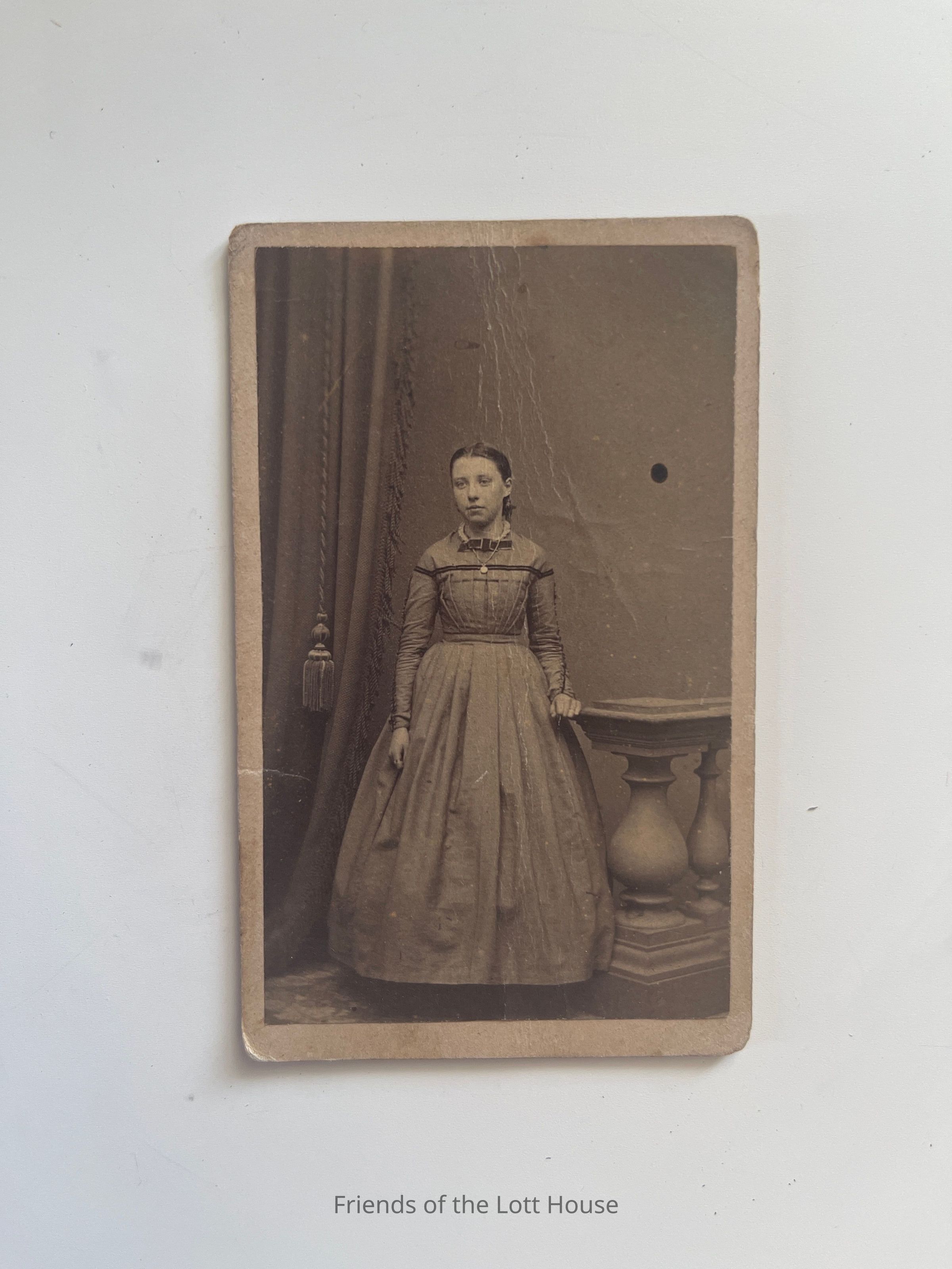 Young woman standing for professional studio photograph. Noted on back as Suydam, John's sister.Collection