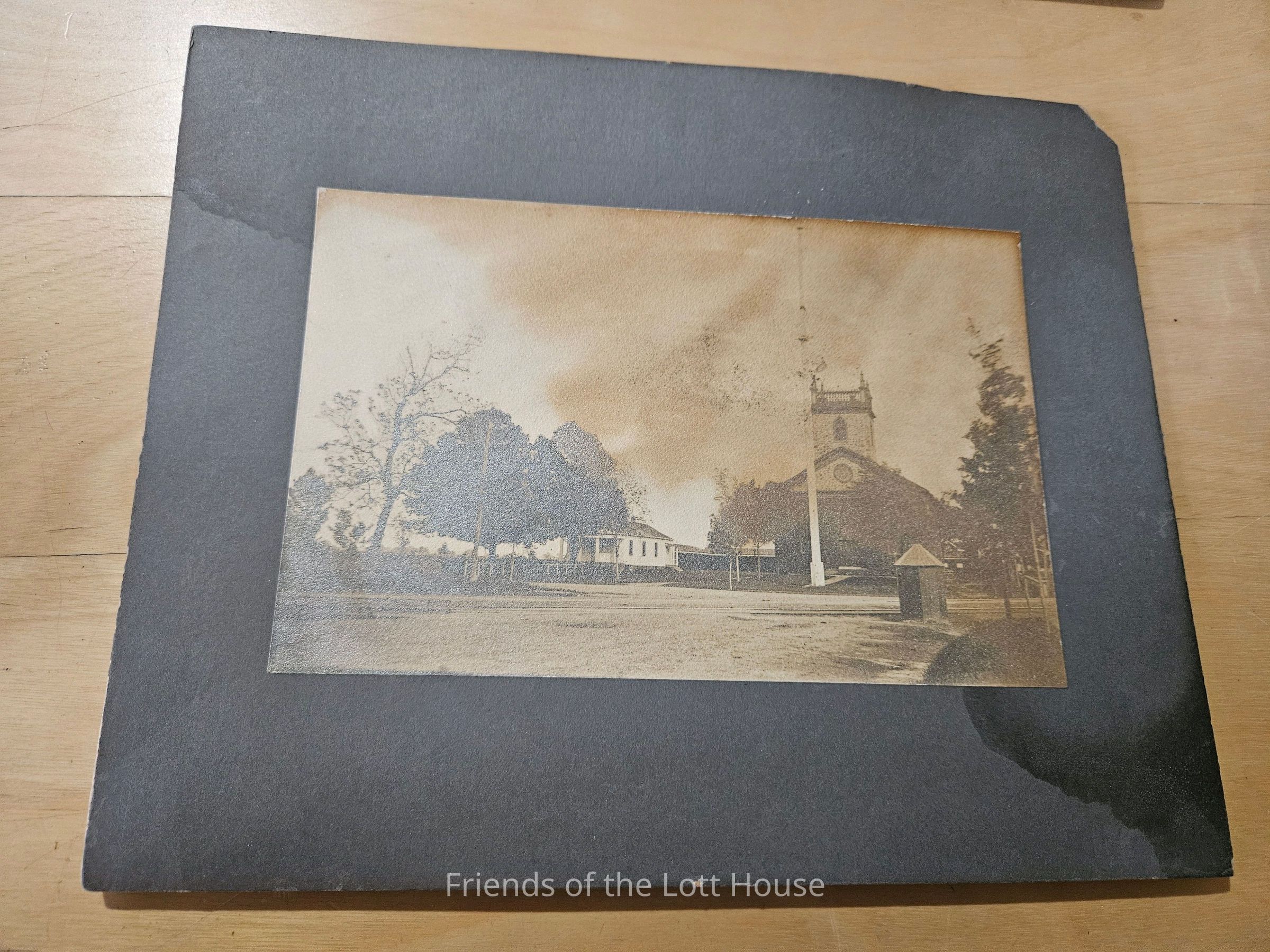 Photograph of a town square with a church, flagpole, and house in the foreground. Water damagedCollection