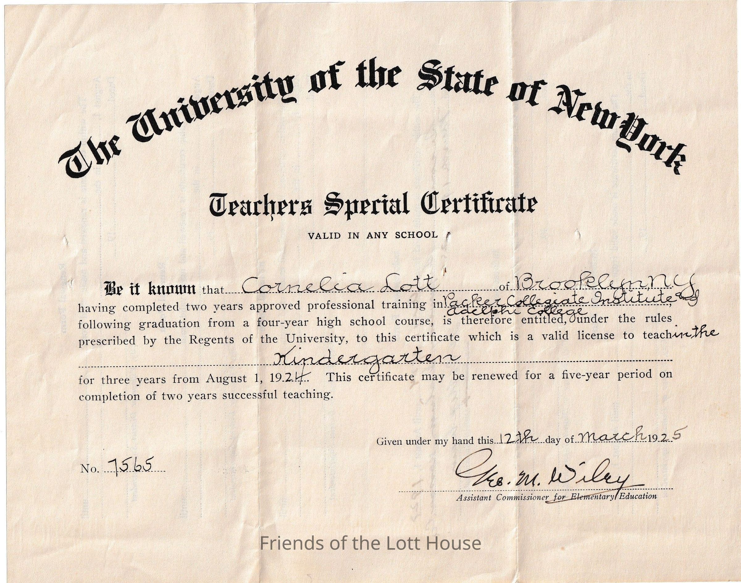 Professional training Teacher's Certificate, Packer Collegiate Institute, Adelphi College, SUNY, for Cornelia LottCollection