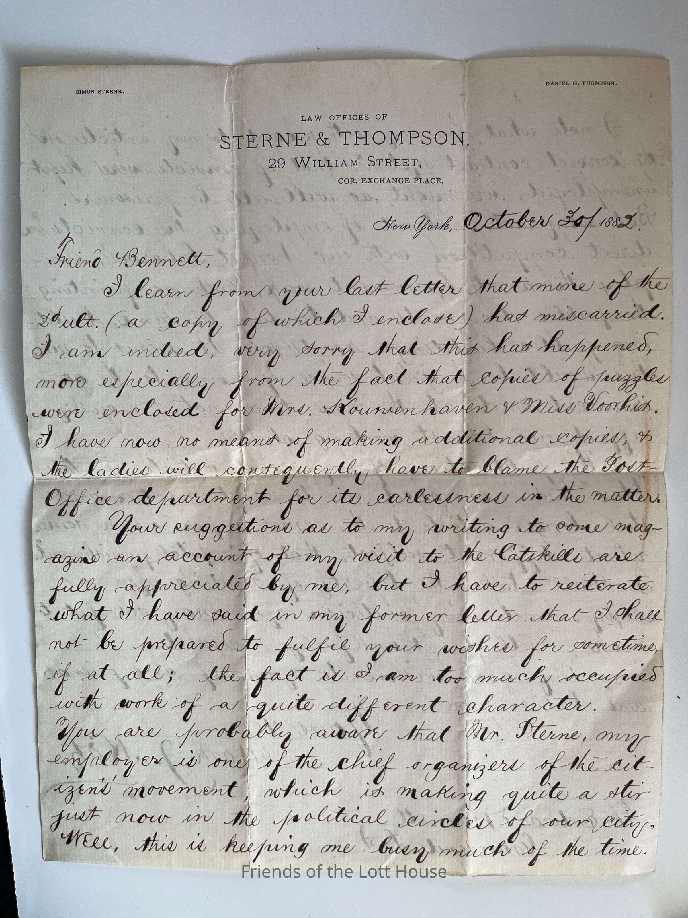 Letter from Mark J. Katz to Edward Bennett, discussing a previous letter and political matters. Dated October 30, 1882Collection