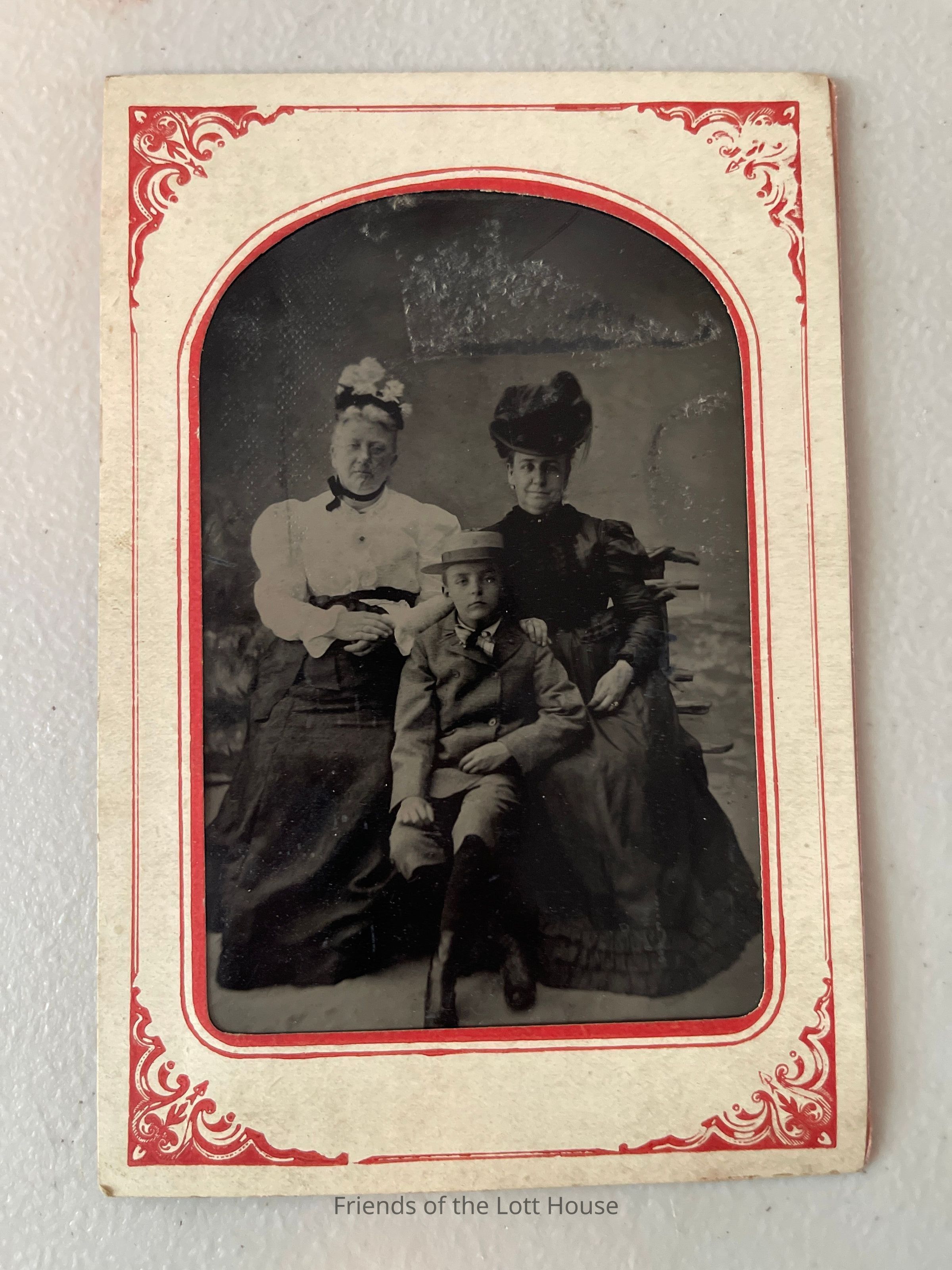 Framed photograph of a two women sitting with a boy in between them. Back says was taken at Brighton Beach photo studio in 1898Collection