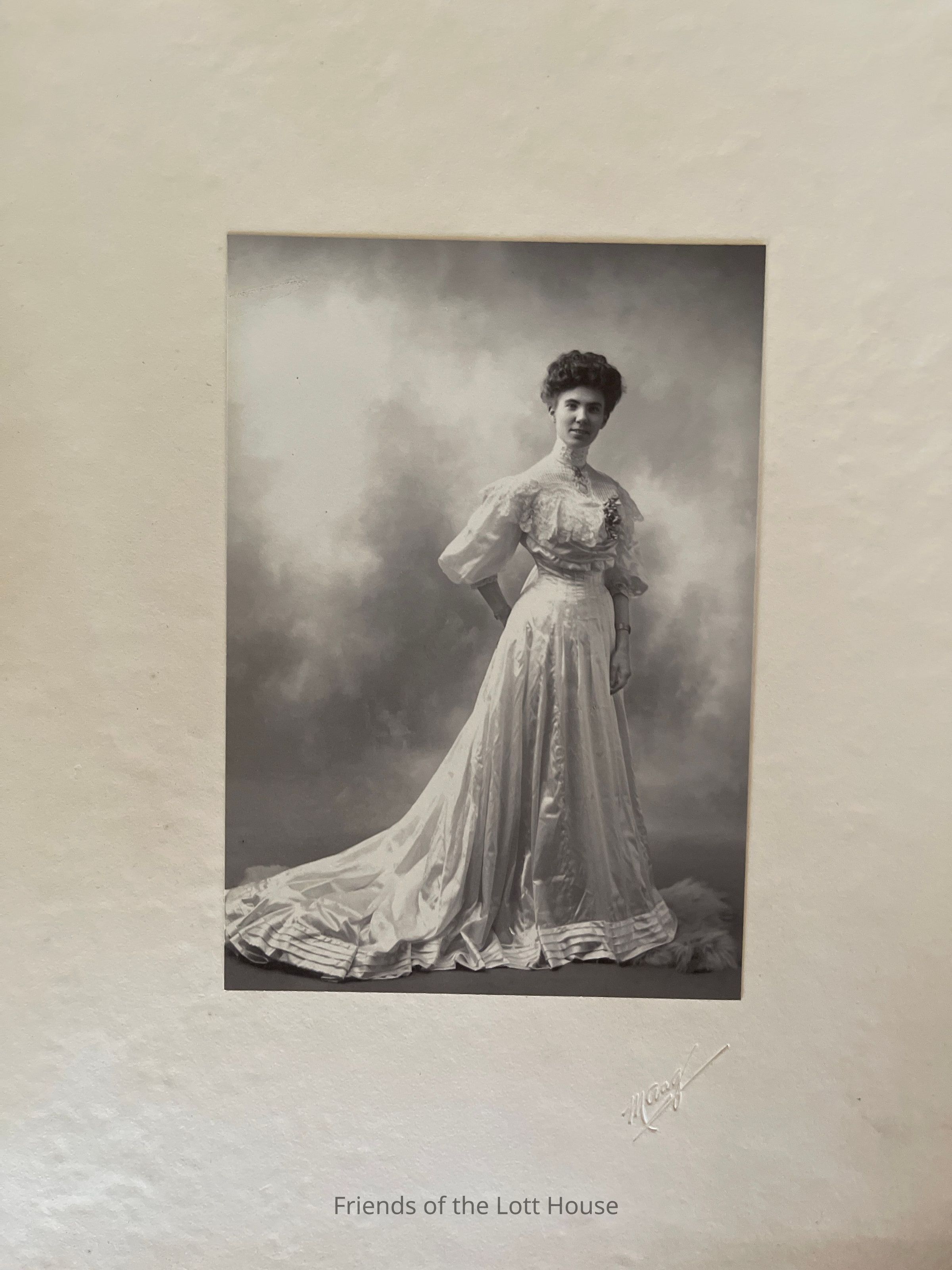 Photograph of a woman standing while wearing a white gown. Katherine Holmes. 1904.Collection