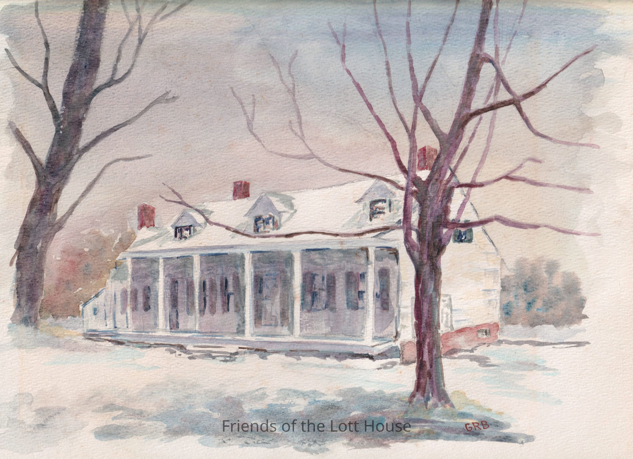 Watercolor painting of the Wyckoff-Bennett Homestead in winter. Signed GRB. Unframed.Type of Painting