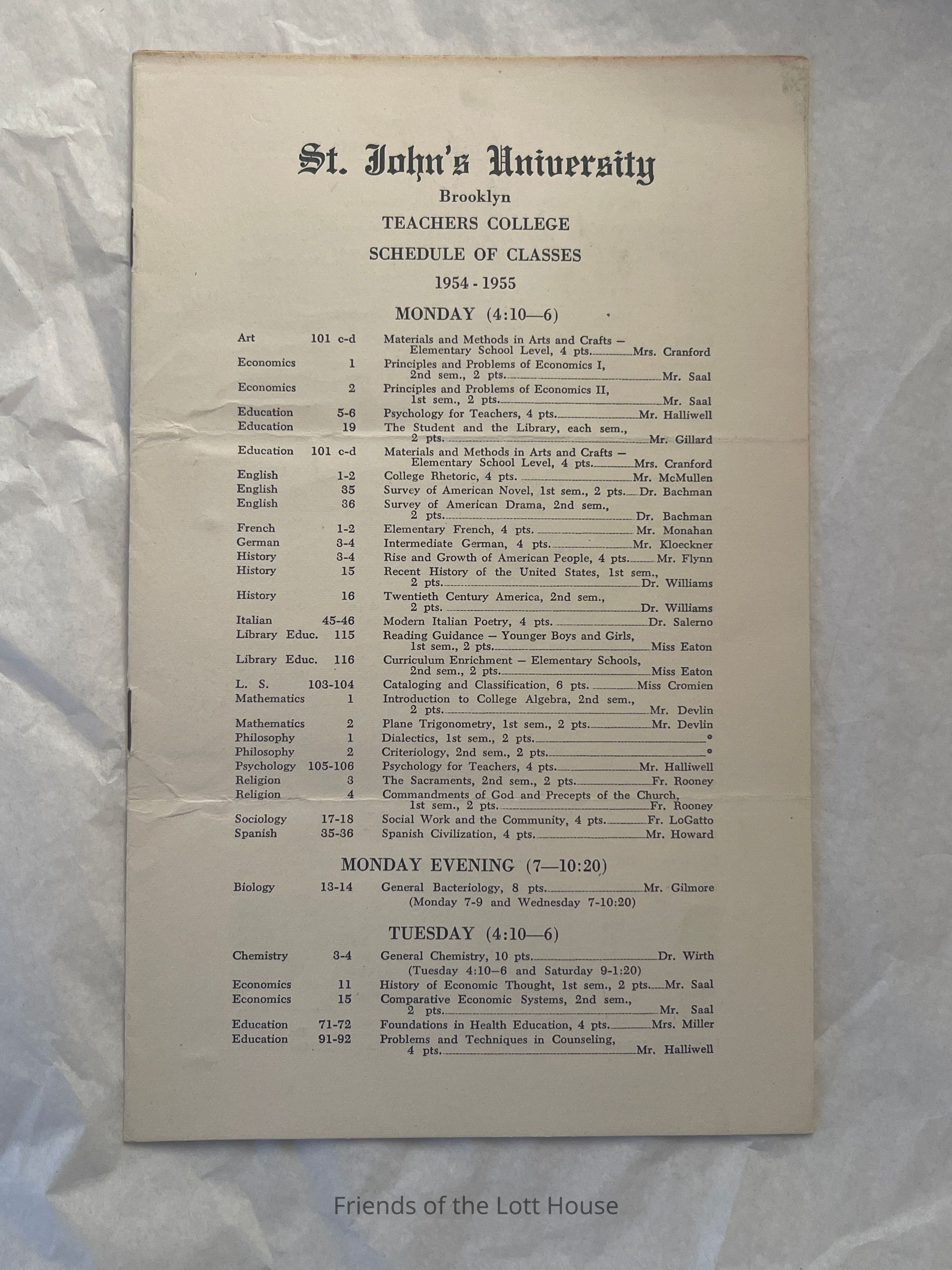 St. John's University Teachers schedule of classes 1954-1955. Three classes taught my Miss Suydam.Category