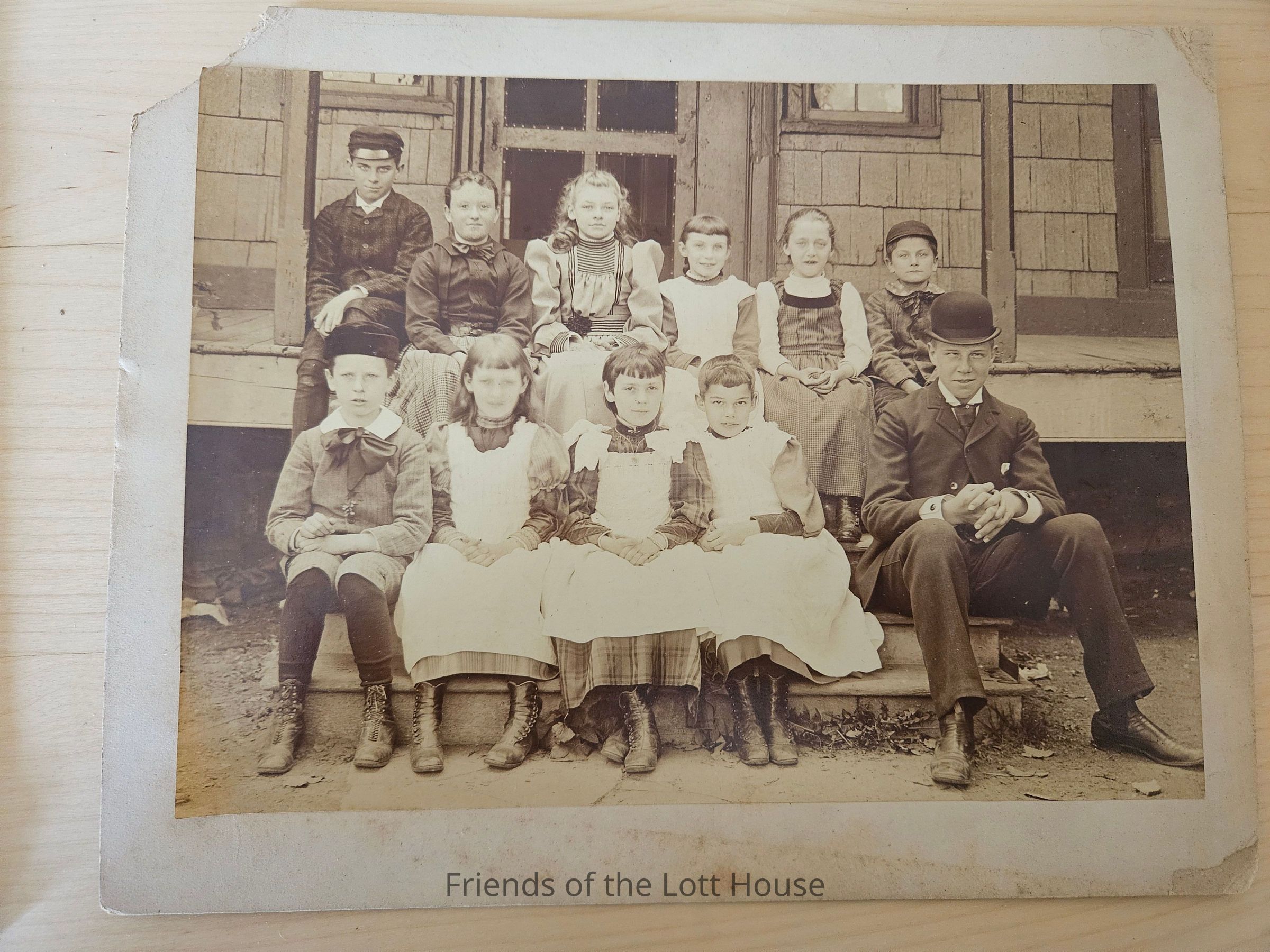 Photograph of a group of children sitting together on a porch.Collection