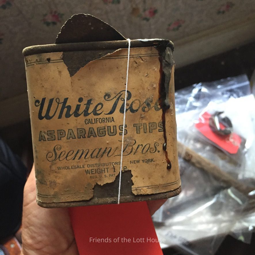 Sheet metal food tin - square shape with rounded corners; white paper label with the following in blue type: "White Rose/California/Asparagus Tips/Seeman Bros./Wholesale Distributors, New York/ Weight 1lb."Collection