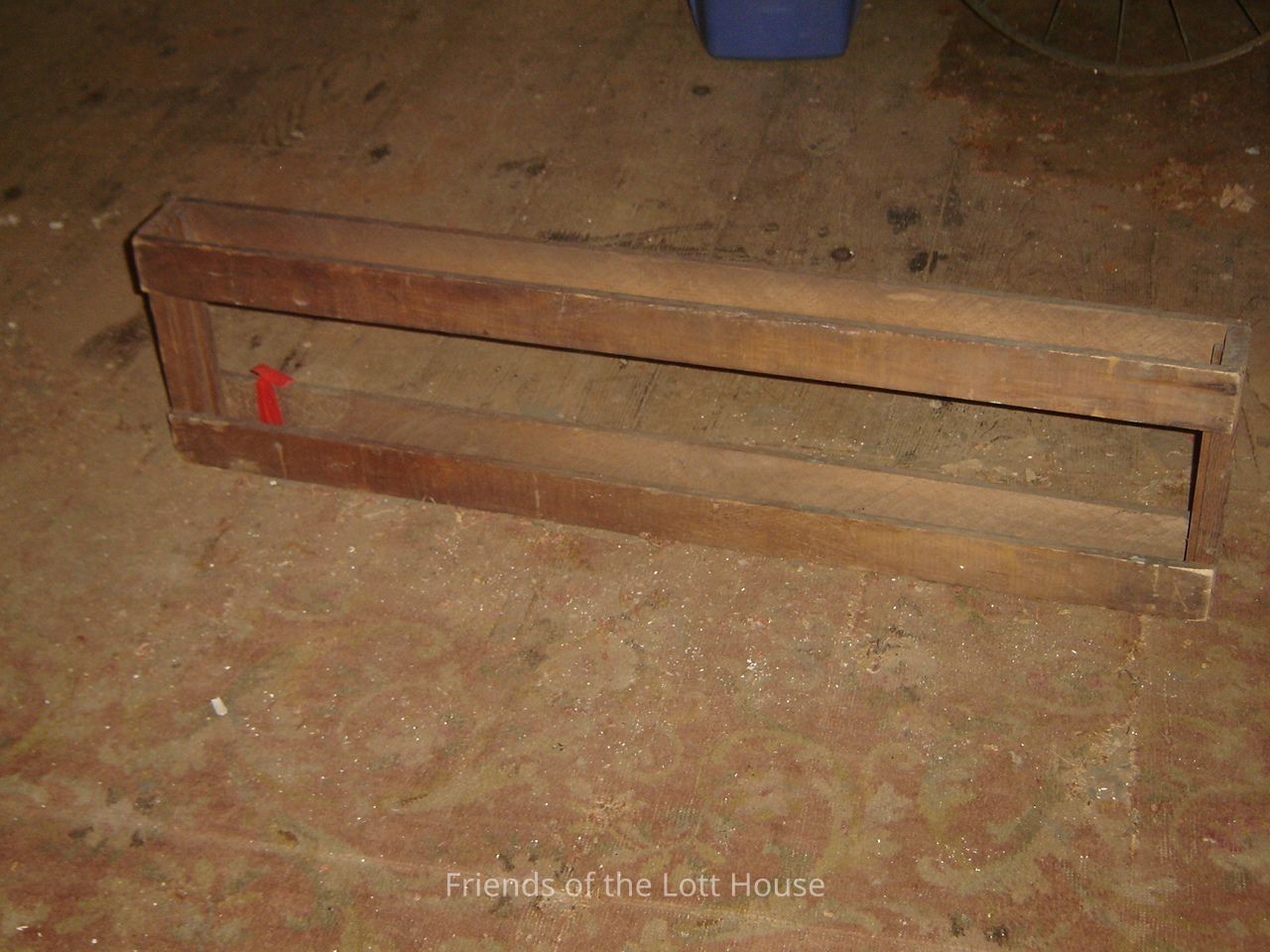 Wood rack, of rectangular shape, comprising four wood slats held between two grooved end pieces; similar to LH2005.015, and similar item hanging in basementAcquisition
