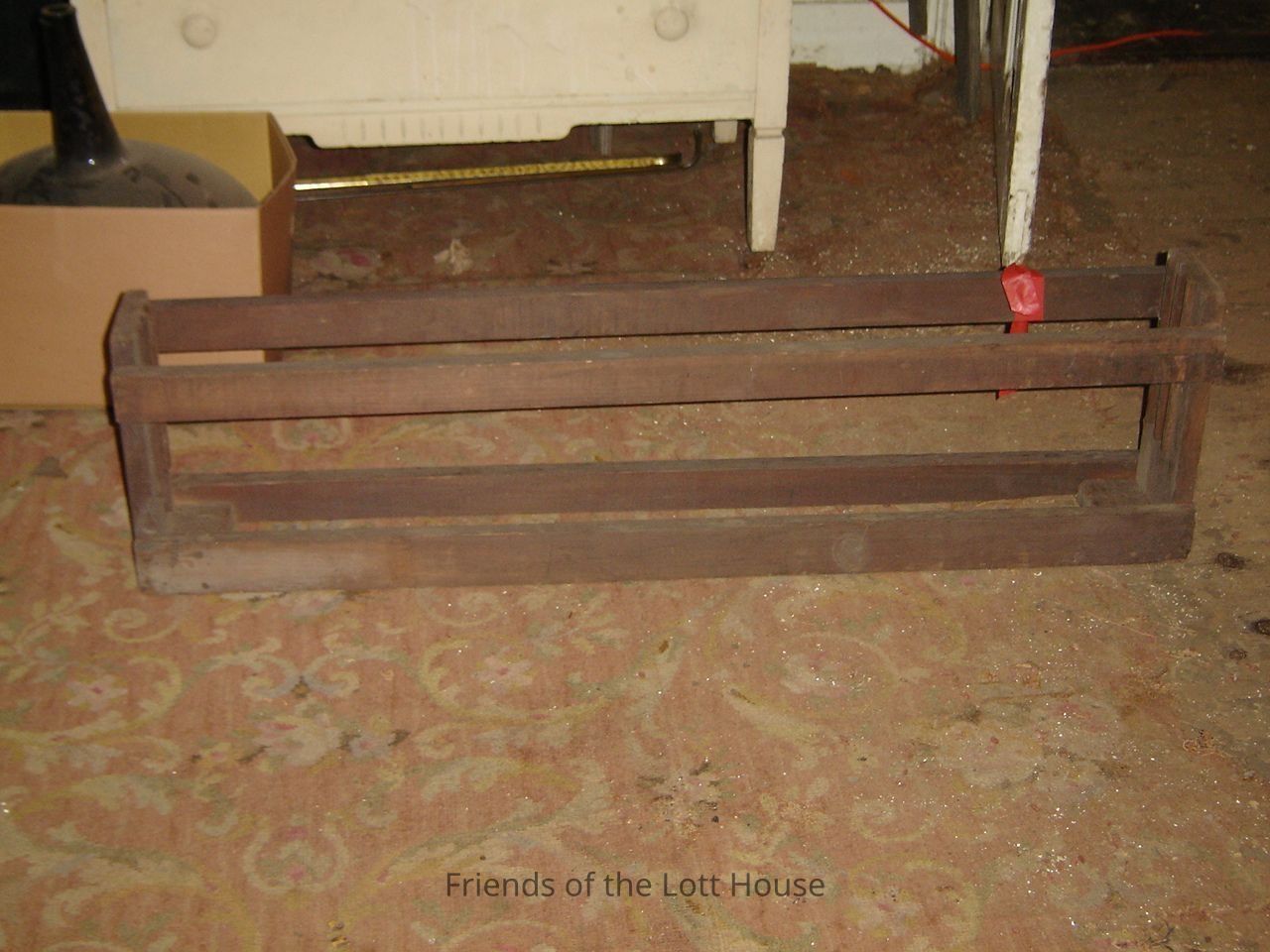 Wood rack, of rectangular shape, comprising four wood slats held between two grooved end pieces; similar to LH2005.012; also similar item hanging in basementAcquisition