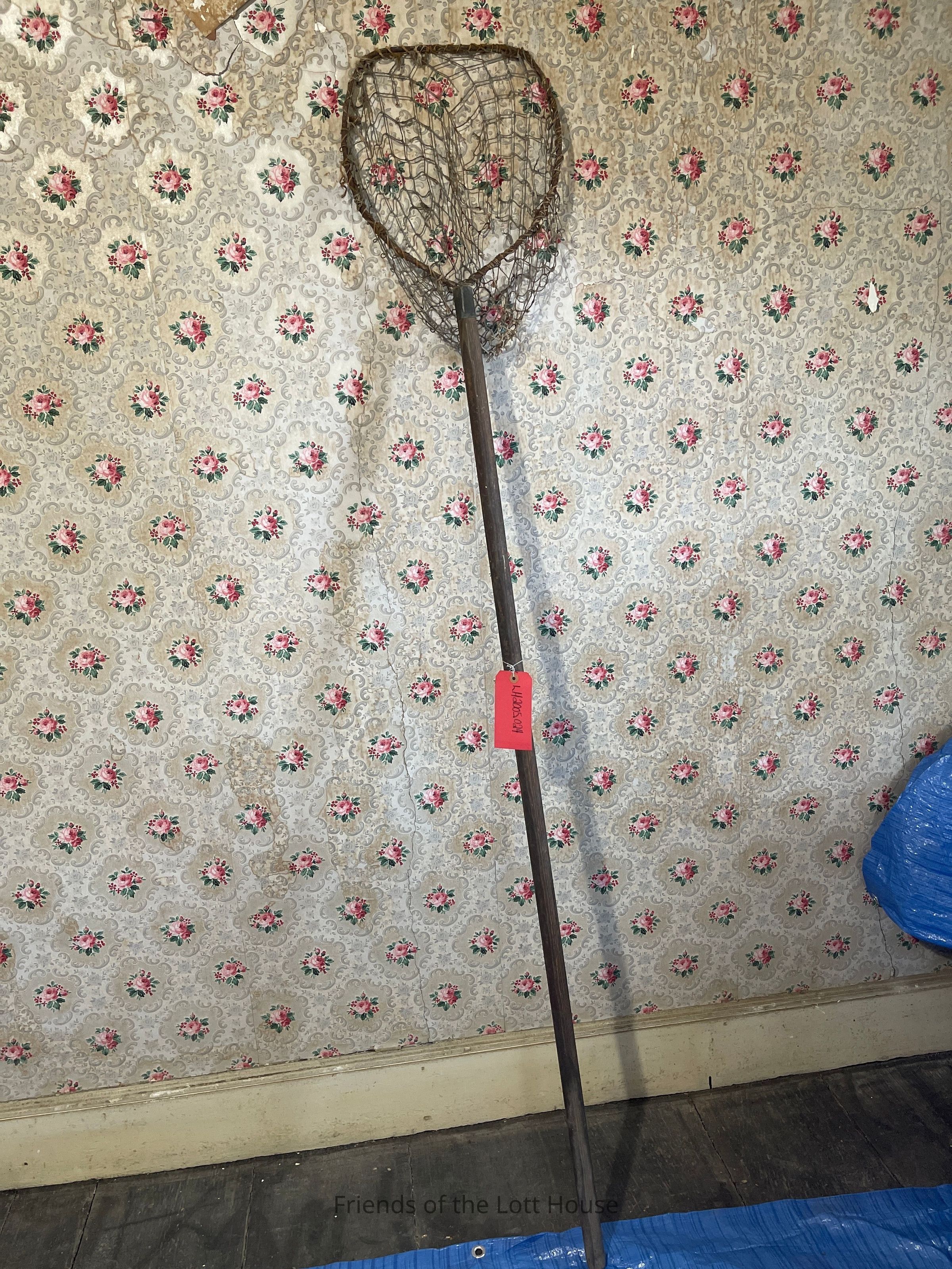 Turned wood pole fitted with round iron frame holding cotton net.Category