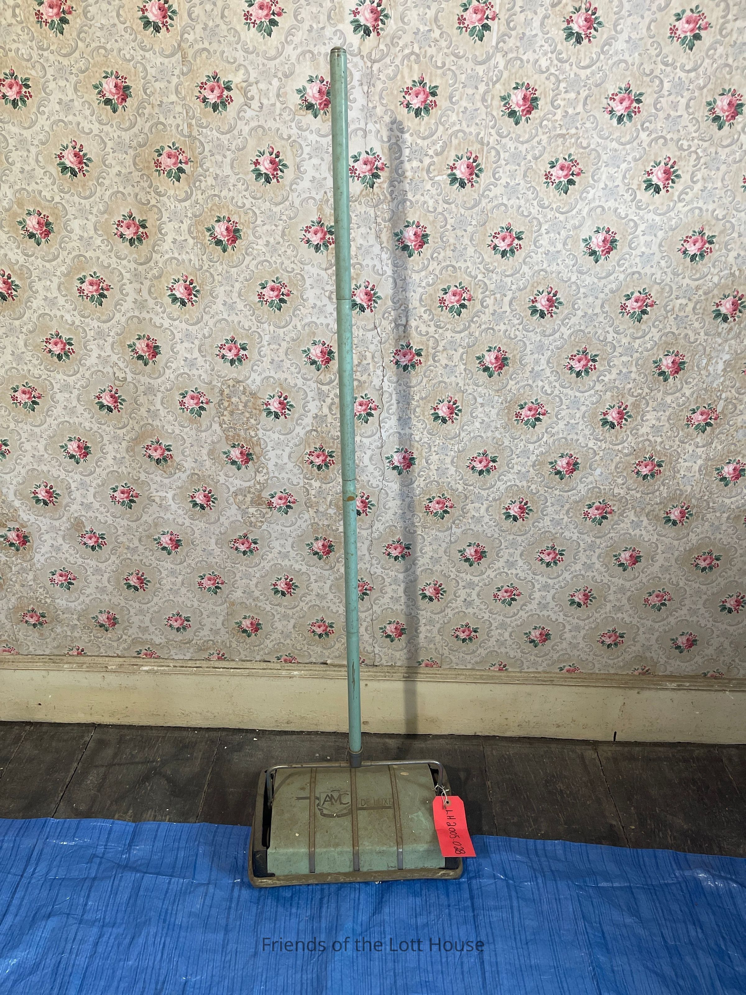 Metal carpet sweeper having light green rectangular head fixed on swinging bar and pole handle, marked "AMC Deluxe"Category