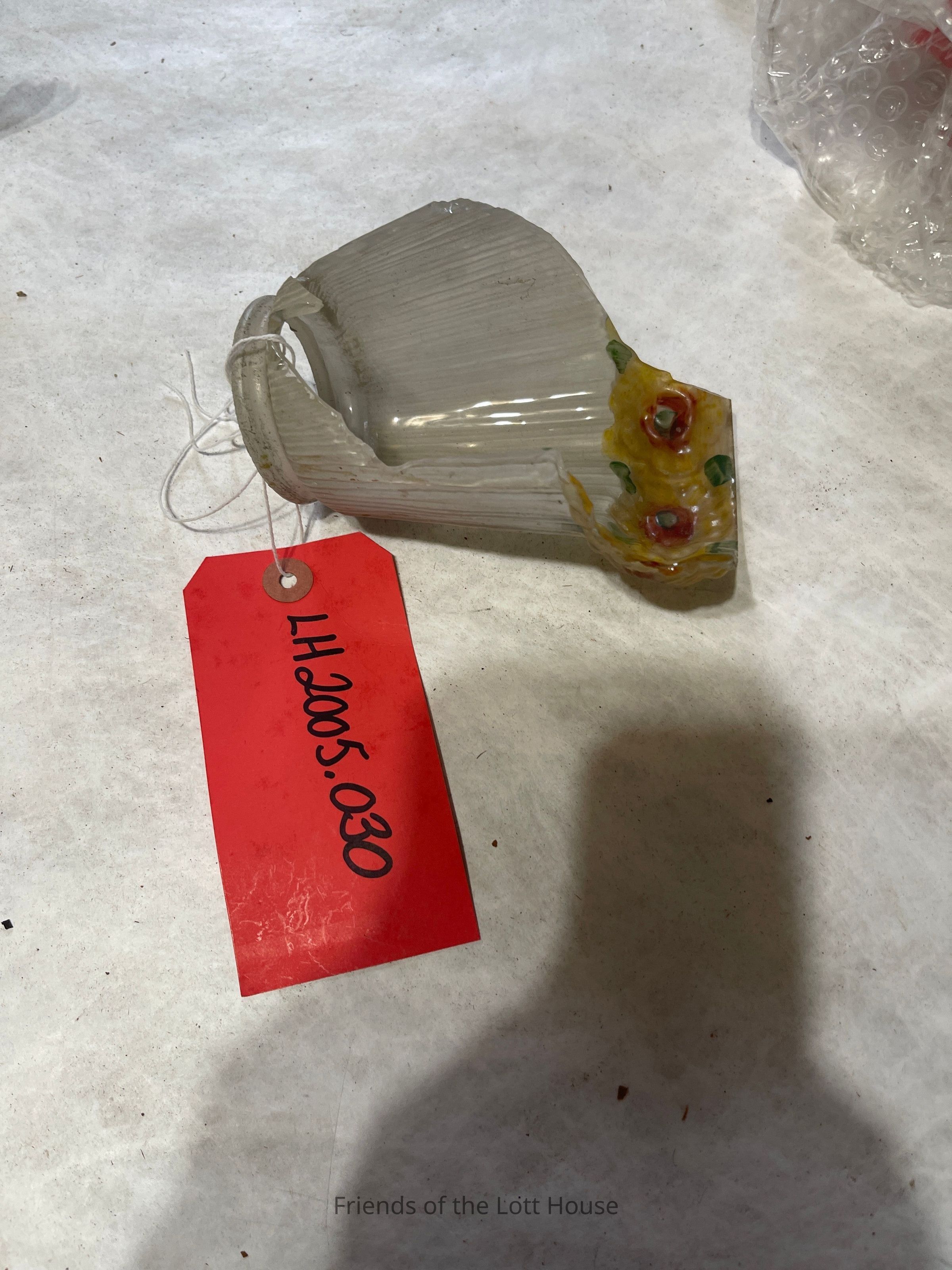 One frosted white glass shade of flared conical shape with fluting and having repeat handpainted floral (sunflowers) pattern at rim. In two pieces (broken)Acquisition