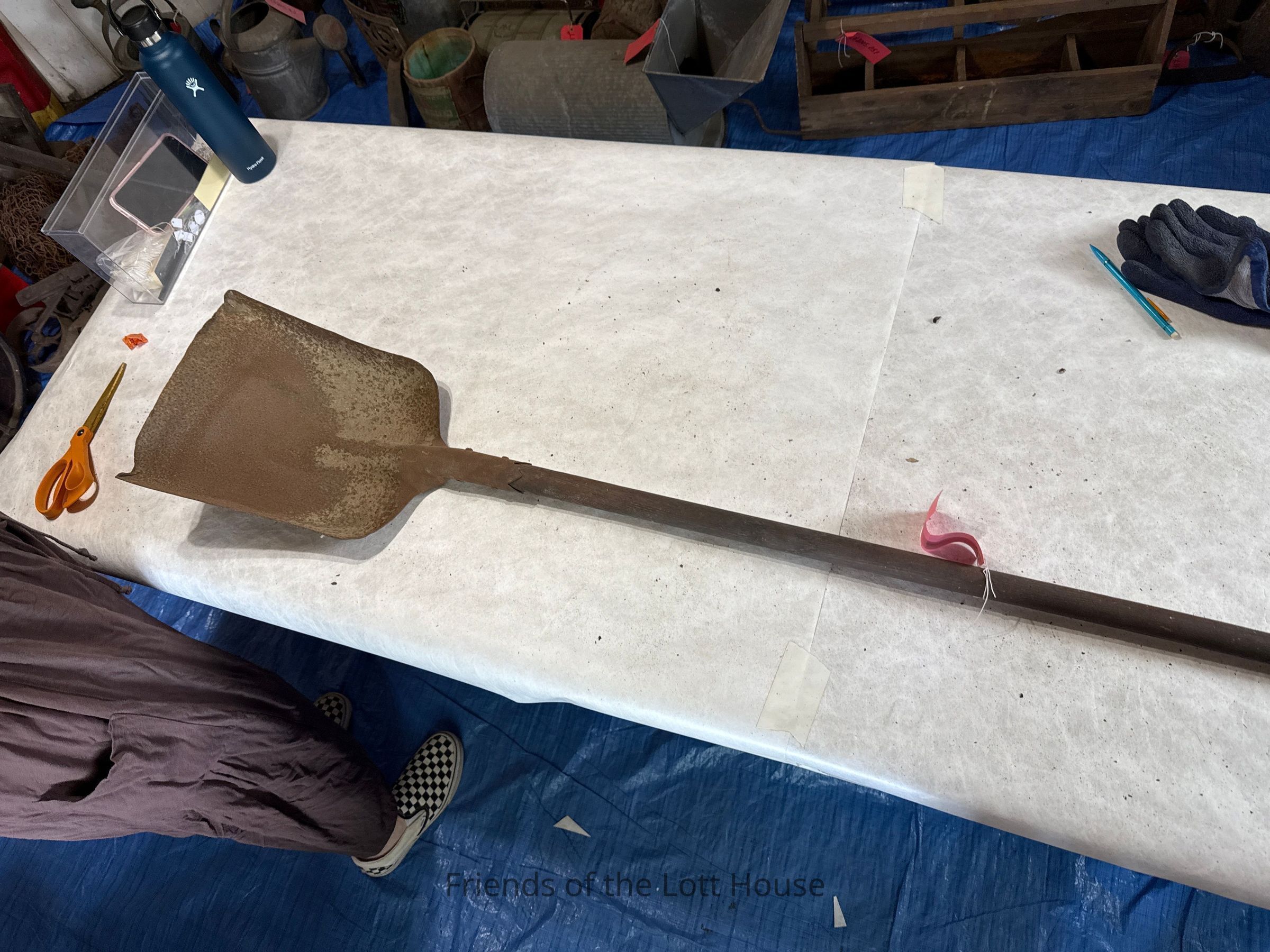 Iron shovel having flat ended scoop and turned wood handleCategory