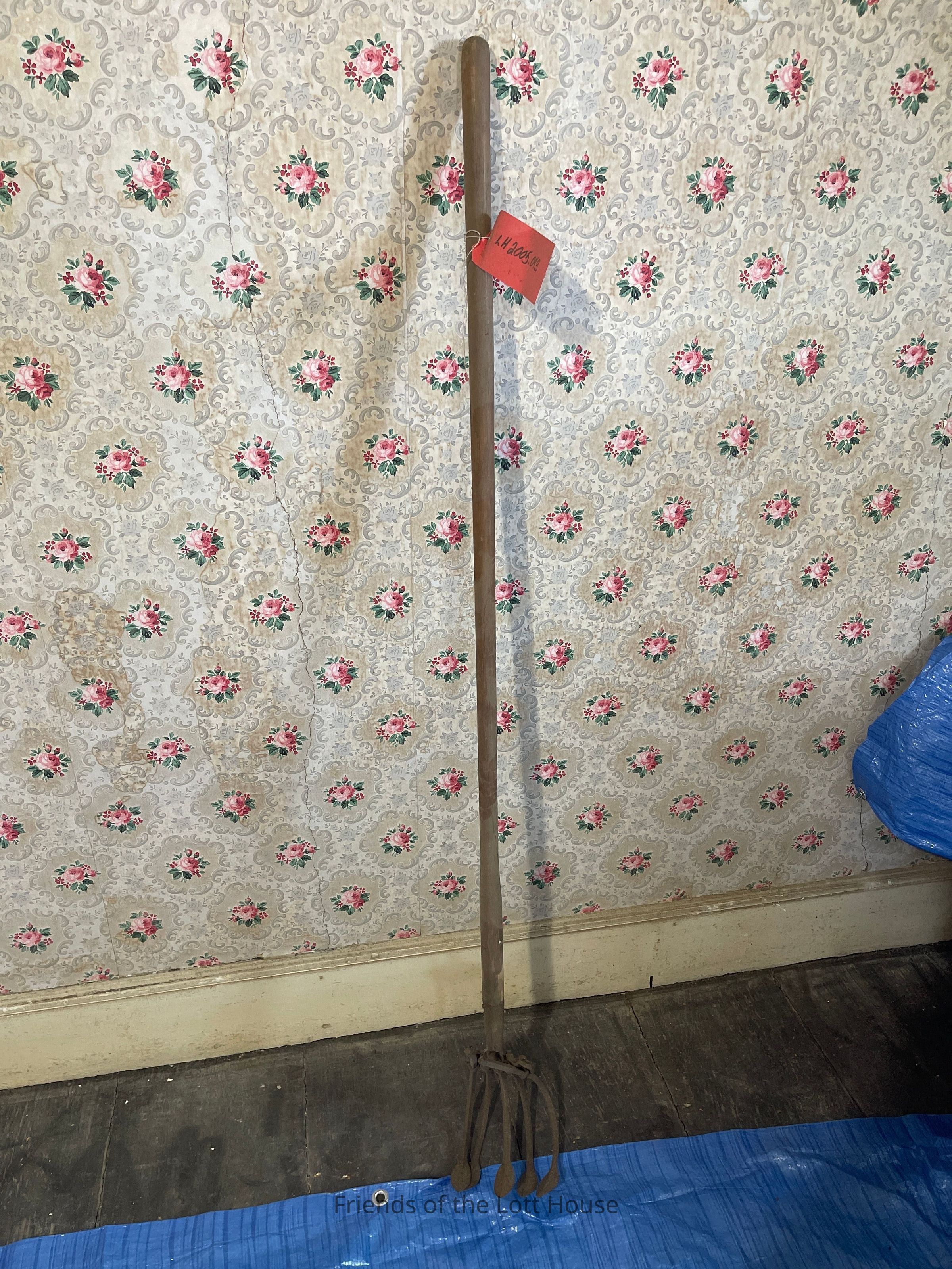 Metal garden rake having three pointed and curled tines fixed on turned wood poleCollection
