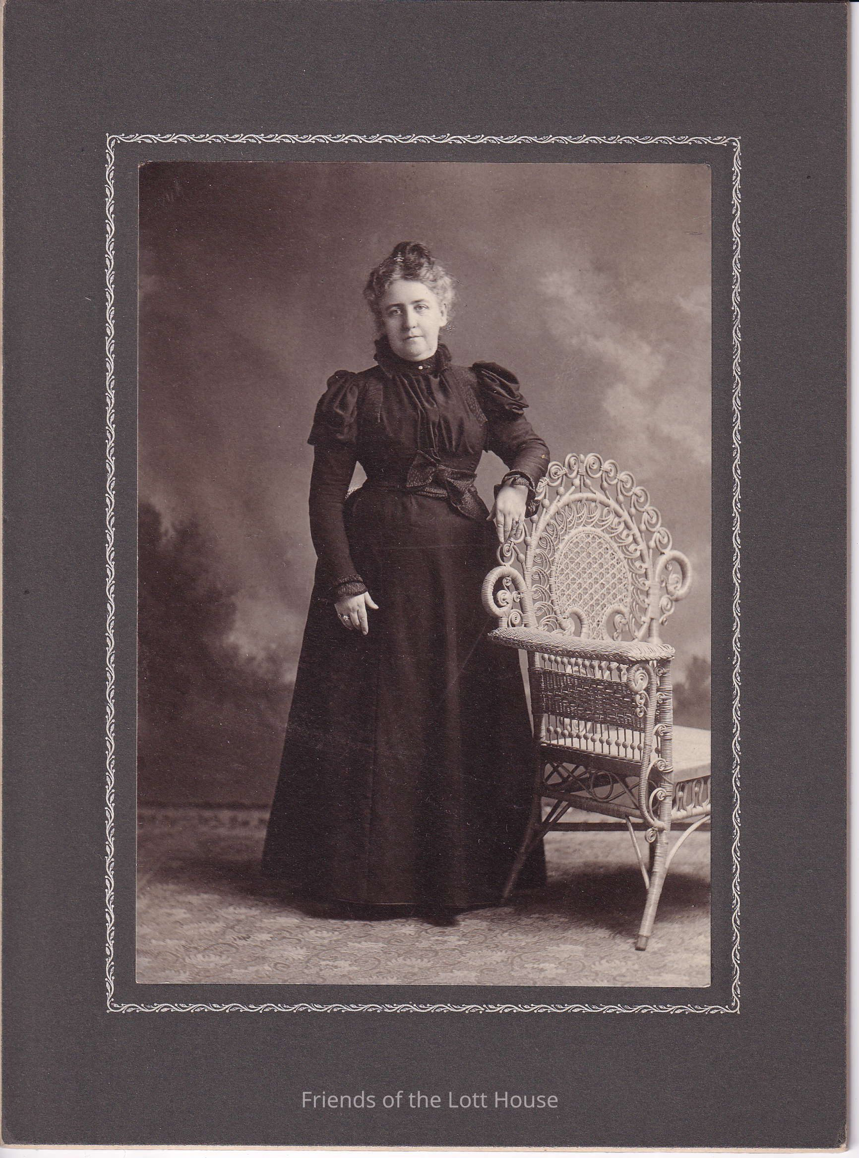Photograph of woman standing, facing forward, while wearing a dark dress and leaning on a white chair. Has dark frameCollection
