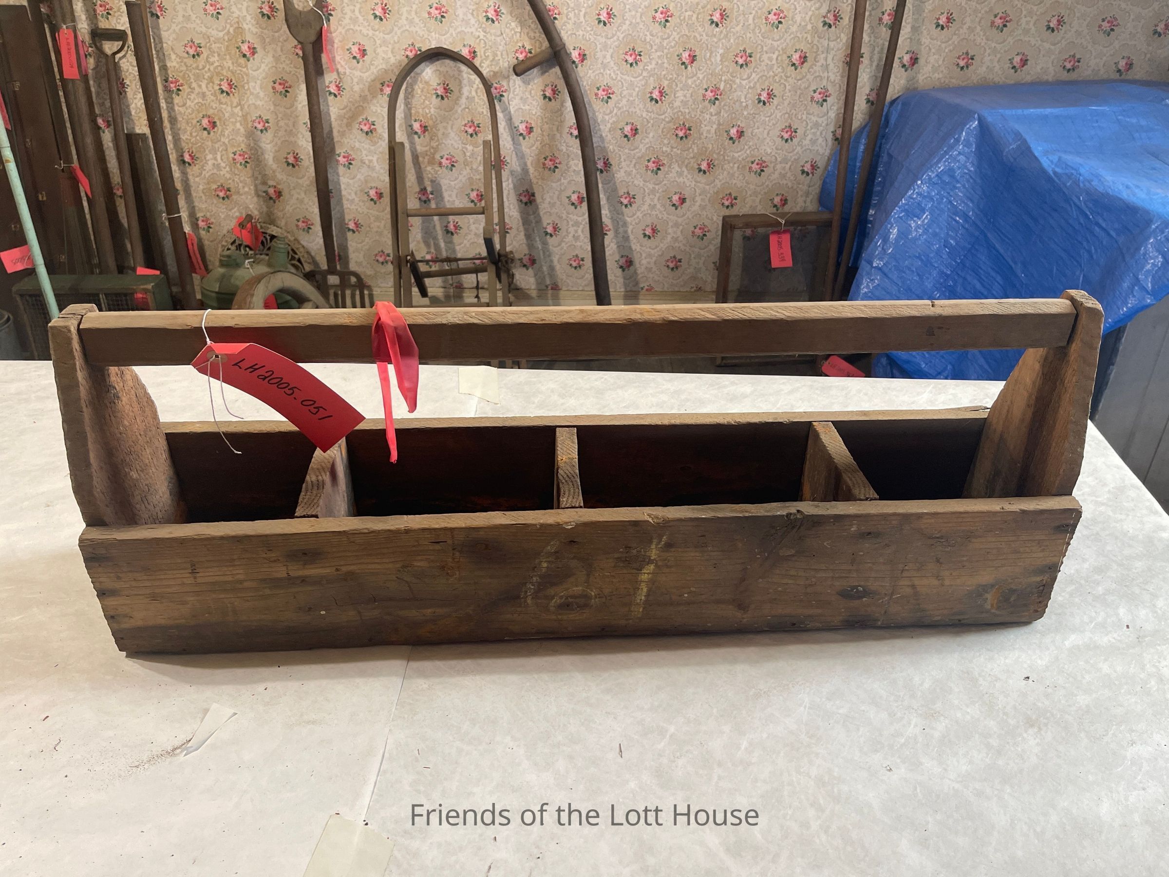 Wood tool box of rectangular shape having four compartments and an octagonal bar supported between peaked end boardsCollection