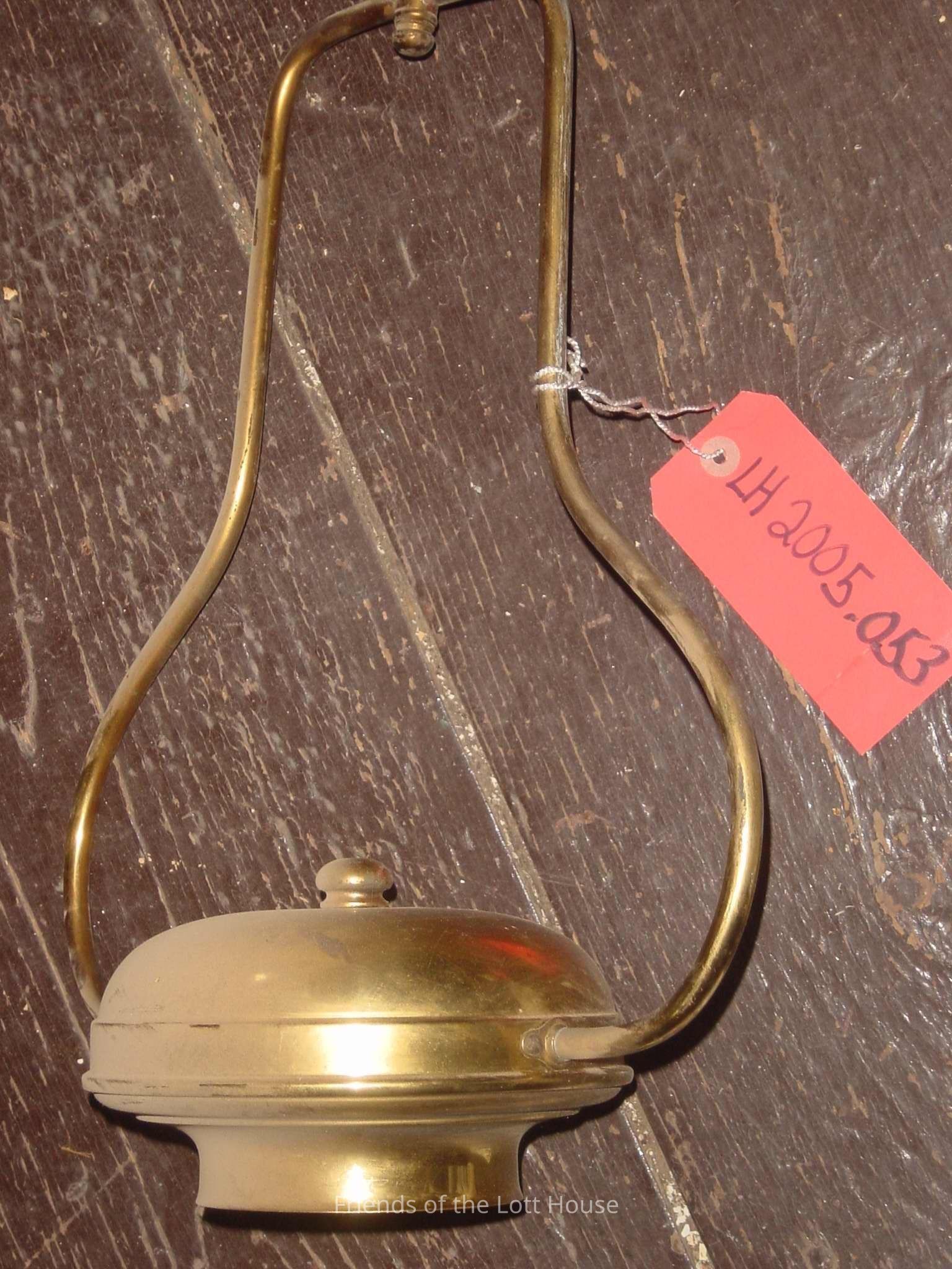 Brass hanging lamp having pear-shaped frame supporting a flattened bun-shaped socket; cloth wiredCollection