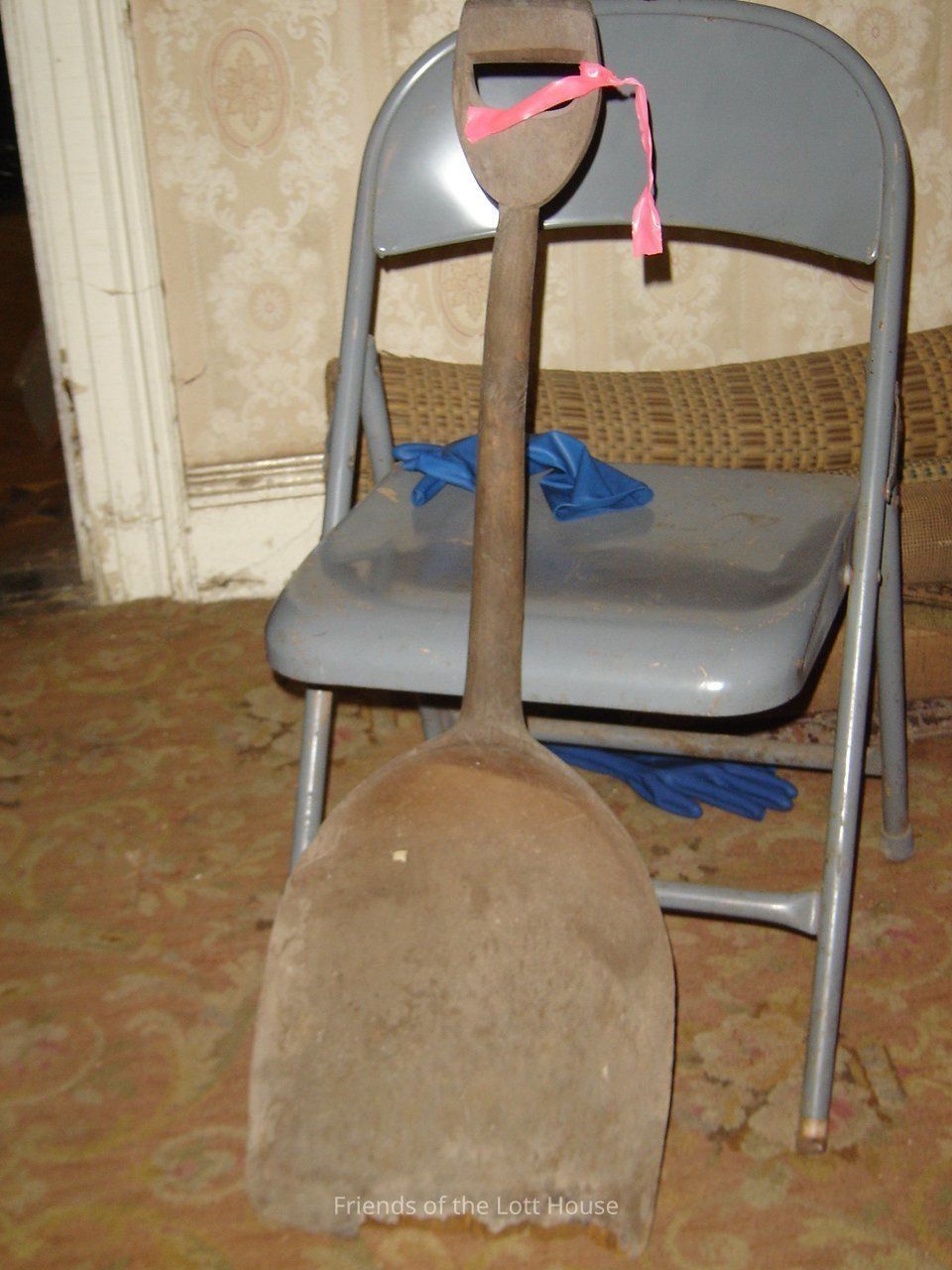 Carved wood shovel having flat ended scoop, wood shaft and handleCollection
