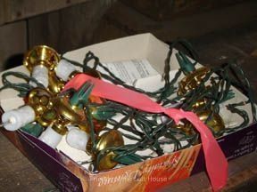 Strand of Christmas lights having white plastic electrified candles set on gold drip pans; housed in manufacturers box with plastic tray insertCollection