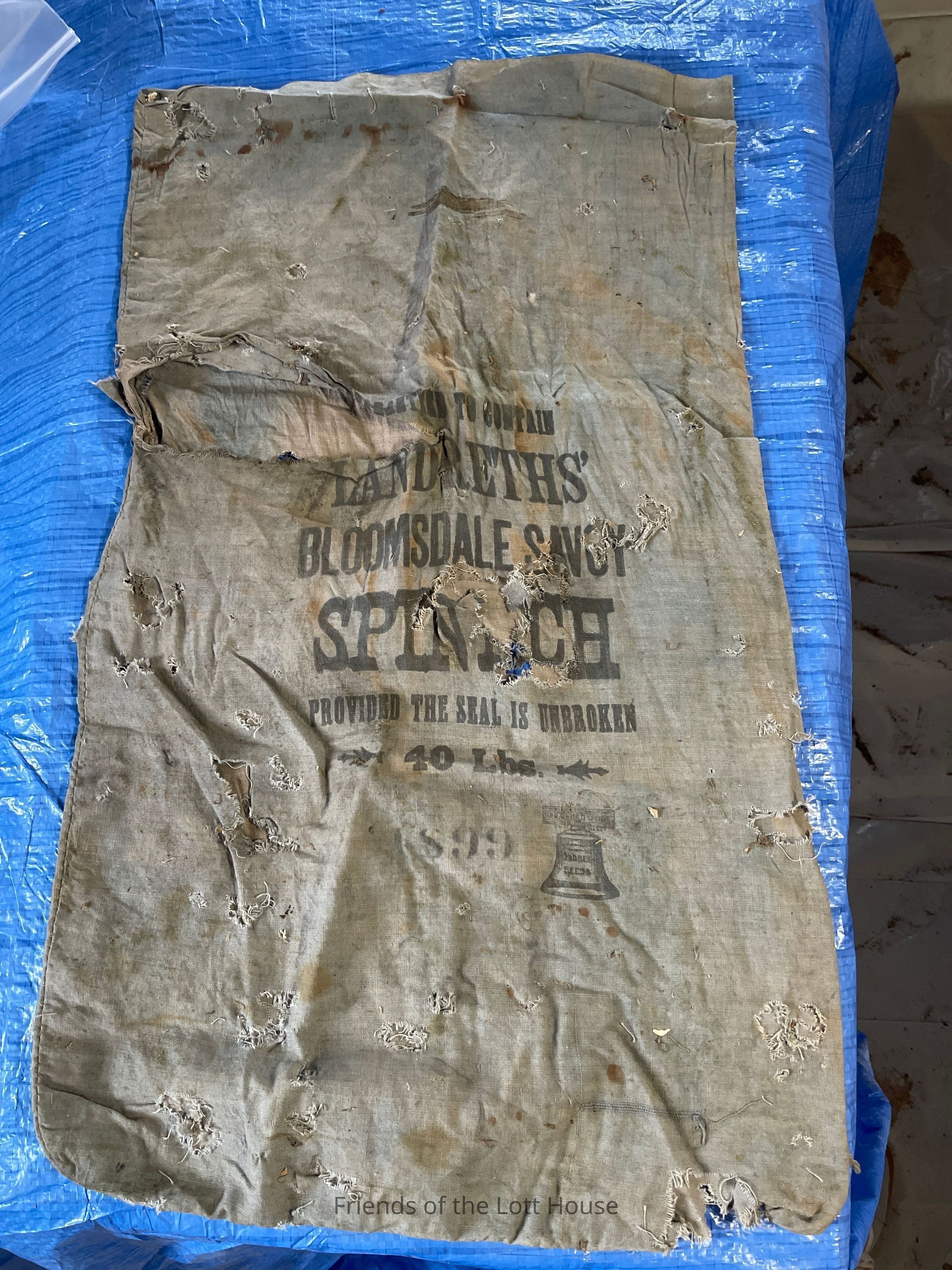Light blue cotton sack, of rectangular shape having open end, stamped on face with black print: Landreth's Bloomsdale Savoy/Spinach/40lbCollection