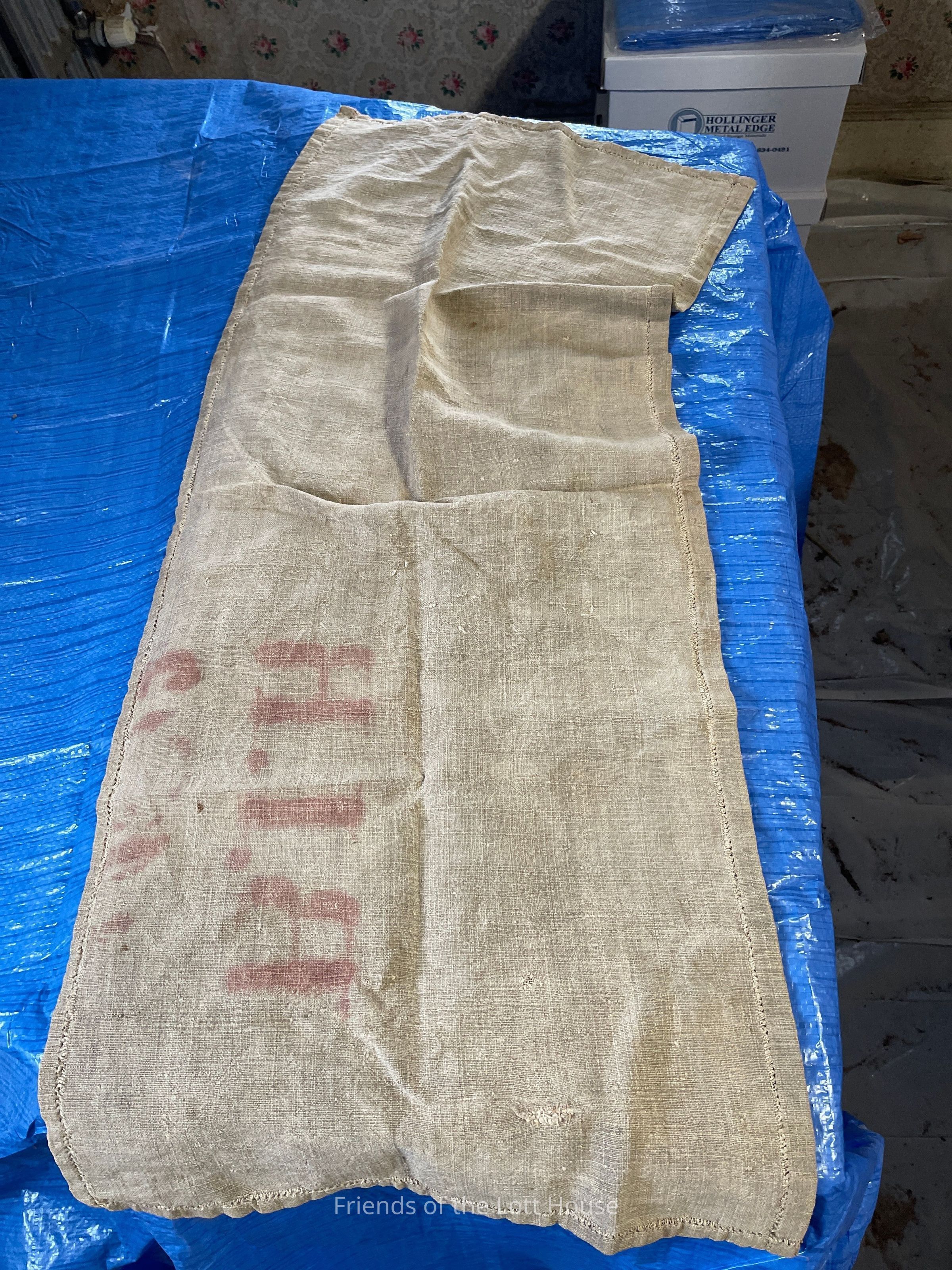 Length of burlap, of rectangular shape, bound on all sides having the red stamped initials, BTHCollection