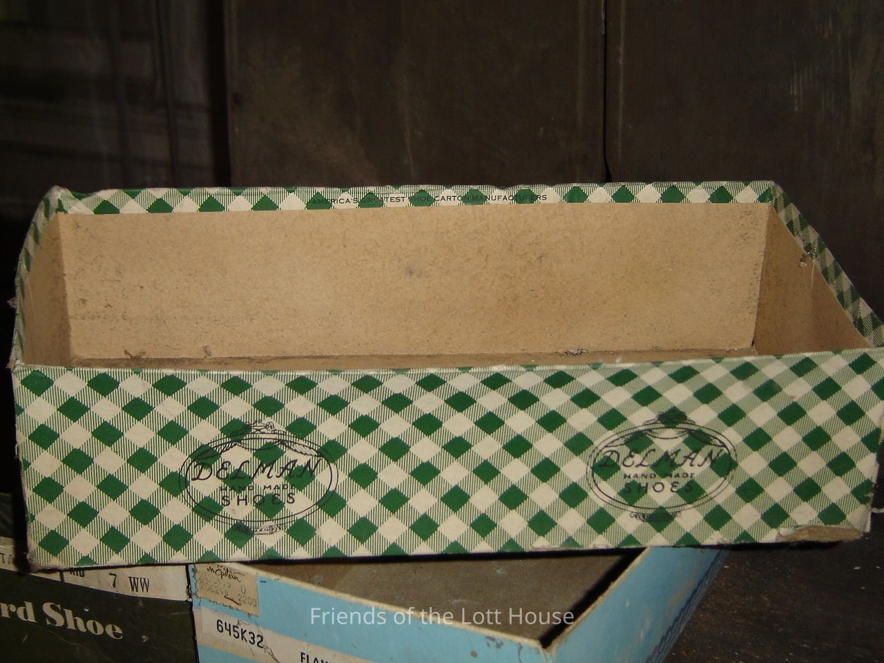 Paper shoe box, of rectangular shape having white and green lattice pattern, and the "Delman" brand name Yellow shipping label printed on one end to E. Suydam from shoe store on 5th Ave. in ManhattanCollection